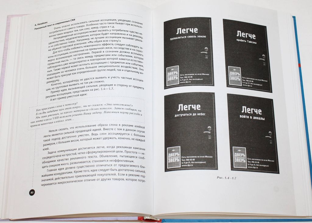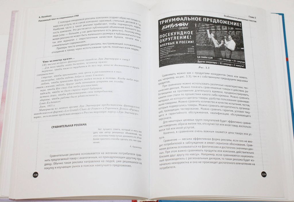 Назайкин А.Н. Рекламный текст в современных СМИ. Практическое пособие. М.: ЭКСМО. 2007г. 352с. Как создаются эффективные рекламные тексты? На основе зарубежного и отечественного опыта автор подробно и популярно разъясняет этот вопрос. В книге рассмотрены все основные аспекты и этапы работы над современным рекламным текстом. Книга рассчитана на читателей, по роду своей деятельности занимающихся рекламой в рекламных отделах компаний, средствах массовой информации, в рекламных агентствах. Она будет полезна также студентам и преподавателям дисциплин, связанных с рекламой. Твердый переплет. Увеличенный формат. Очень хорошее состояние.