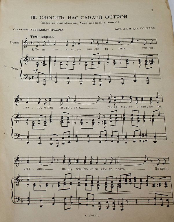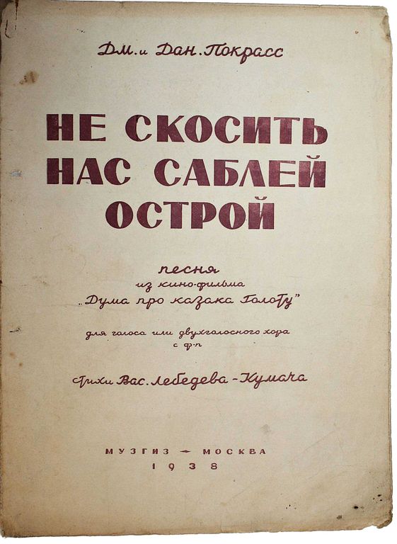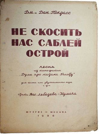 Дм. и Дан. Покрасс. Не скосить нас саблей острой. Песня из кино-фильма `Дума про казака Голоту`. Стихи В.Лебедева-Кумача. М.: Музгиз, 1938. – 6 с., нот. Мягкая обложка. Энциклопедический формат, 30.5х22.5 см. Братья Даниил и Дмитрий Покрассы — крупнейшие советские композиторы-песенники, основоположники революционной музыкальной эстетики. Особенно прославились сочинением ярких, бравурных, летучих маршей. Хорошее состояние.