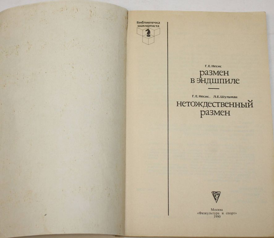 Несис Г.Е., Шульман Л.Е. Размен в эндшпиле. Нетождественный размен. Серия: Библиотечка шахматиста. М.: Физкультура и спорт. 1990г. 160с. В первой части автор систематизировал материал по данному вопросу, выделив важнейшие предпосылки к разменам в эндшпиле, показал роль размена как инструмента реализации перевеса или средства нейтрализации преимущества сильнейшей стороны. Во второй работе авторы систематизировали несхожие по техническому оформлению и стратегическим задачам размены по принципам нестандартного соотношения материала. Мягкий переплет. Обычный формат. Хорошее состояние.