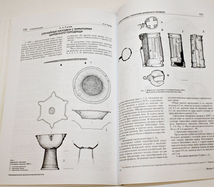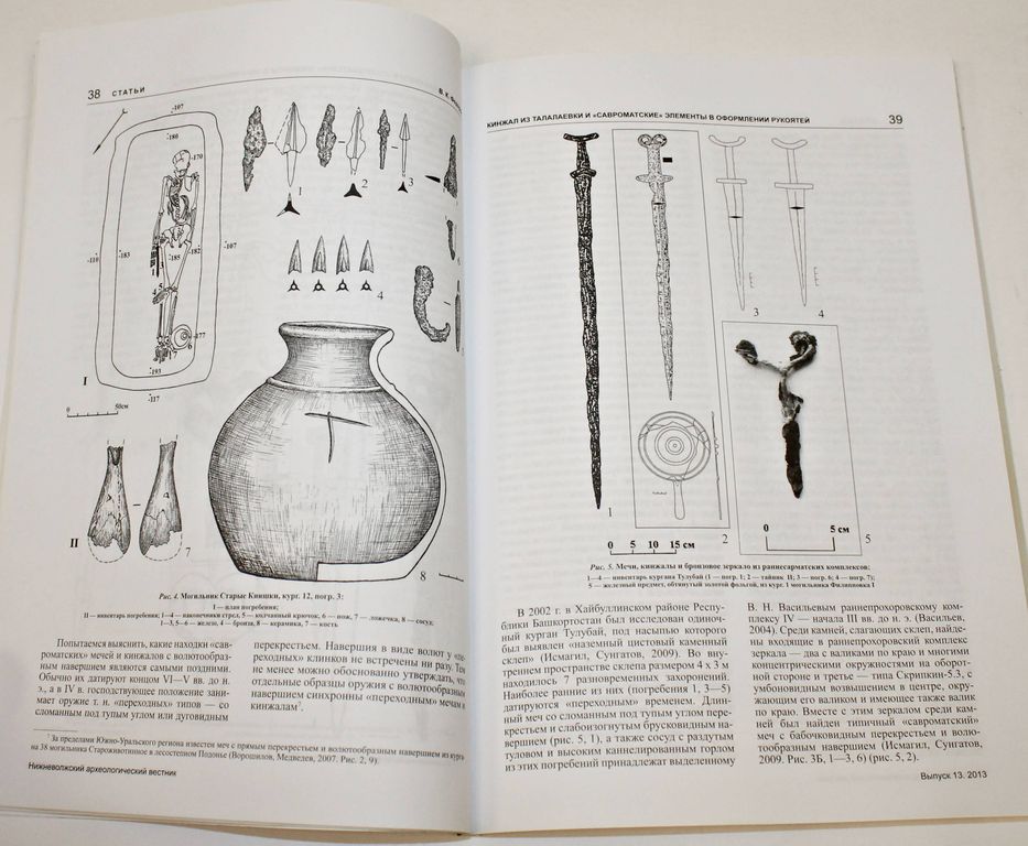 Нижневолжский археологический вестник (НАВ). Выпуск 13. Волгоград: Издатель. 2010г. 160с., ил. Мамонтов К истории сталинградской археологии. Демкин и др. Возраст и активизация микробных сообществ подкурганных и современных почв степей Нижнего Поволжья. Скрипкин Версии об этнической принадлежности кочевников Южного Приуралья скифского времени. Шевченко Раннекочевнические женские погребения с оружием из Южного Приуралья 6-4 вв. до н.э. Федоров Кинжал из Талалаевки и савроматские элементы в оформлении рукоятей прохоровских клинков. Воронятов Центральная Азия и Северное Причерноморье: параллели предметов с тамгами. Кириченко О деформации черепа у остготов. Шефер Сравнительный анализ изображений на бронзовых поясных пластинах гунно-сарматского времени и Т- и Y-образных предметах из рога эпохи средневековья. Исаков и др. Парадные золотые пояса раннеджучидского времени из Олень-Колодезя и Гашун-Уста: историко-культурный и семантический аспекты исследования. Яценко Ограбление сарматских курганов в древности: методы и цели. Скворцов Курганная группа Майеровская. Круглов Погребение горизонта Суханово (Большой Токмак - Суханово - Царев) второй половины VI - начала VII века из Царевского курганного могильника. Глухов Случайные находки с территории Царевского городища. Мамонтов Случайная находка из Иловлинского района. Матаев Одиночный курган у пос. Первомайский. Шинкарь, Мамонтов Особенности производства и происхождение мегарской чаши из кургана 1 Мариновского могильника. Коробкова Алебастр из погребения 3 кургана 34 Жутовского курганного могильника. Кривошеев Серебряные изделия как хроноиндикатор в позднесарматских комплексах. Круглов Подкурганное ямное погребение салтово-маяцкой культуры из могильника Ольховка. Лапшин О некоторых итогах раскопок на Водянском городище в 2012 г. Демкину 60 лет. К юбилею Клепикова. К юбилею Дьяченко. Каргин К юбилею подросткового археологического клуба Легенда. Тираж 300 экз. Мягкий переплет. Энциклопедический формат. Хорошее состояние.
