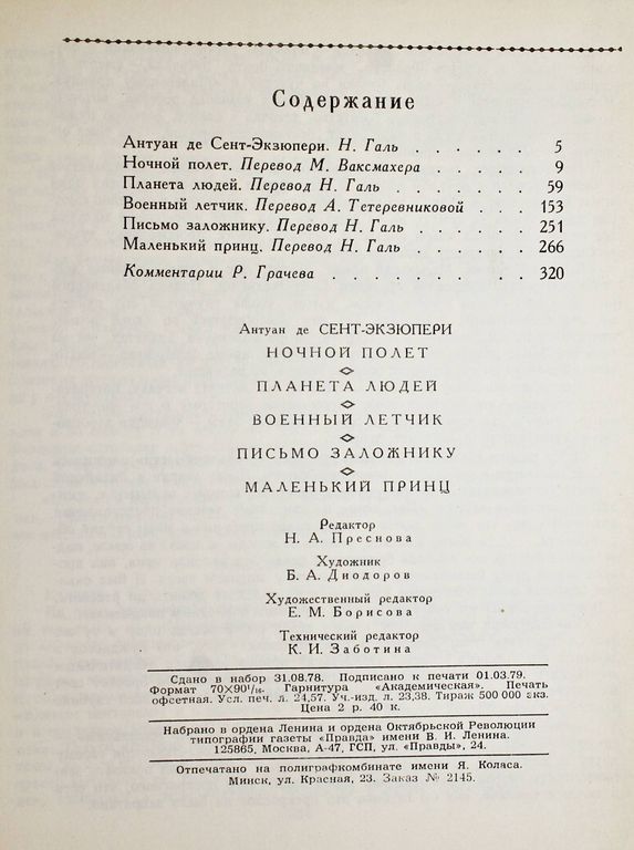 Экзюпери Антуан де Сент. Ночной полет. Планета людей. Военный летчик. Письмо заложнику. Маленький принц. М.:Правда. 1979г. 335с. Содержание: - Н. Галь. Антуан де Сент-Экзюпери. - Ночной полет (перевод М. Ваксмахера). - Планета людей (перевод Н. Галь). - Военный летчик (перевод А. Тетеревниковой). - Письмо заложнику (перевод Н. Галь). - Маленький принц (перевод Н. Галь). Твердый переплет. Увеличенный формат. Очень хорошее состояние.