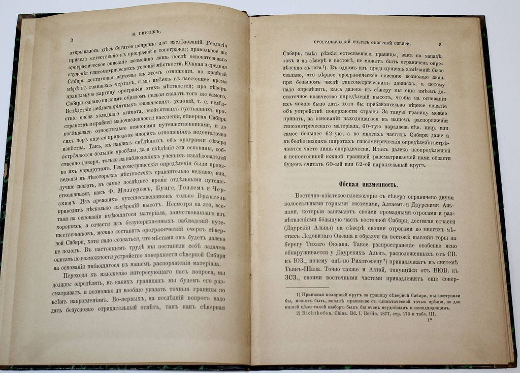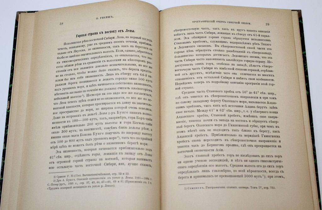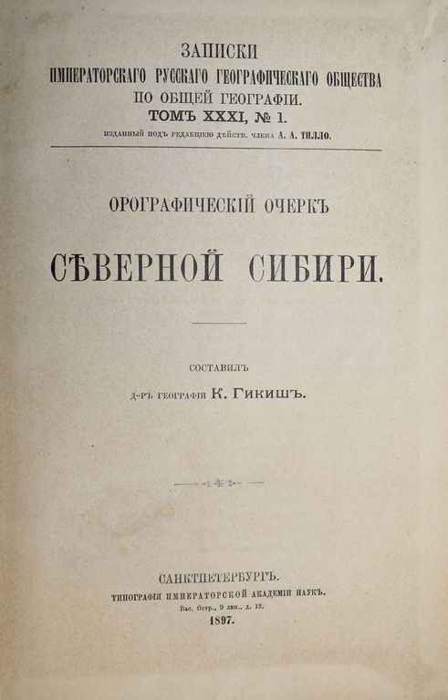 Гикиш К. Орографический очерк Северной Сибири. Записки Императорского Русского географического общества по общей географии. Том XXXI, №1. СПб.: Тип. Имп. Академии наук, 1897. – 62, [2] с. Владельческий полукожаный переплет. Увеличенный формат, 24х16 см. Хорошее состояние. Следы `мытых` инв. отметок, реставрация тит. листа.