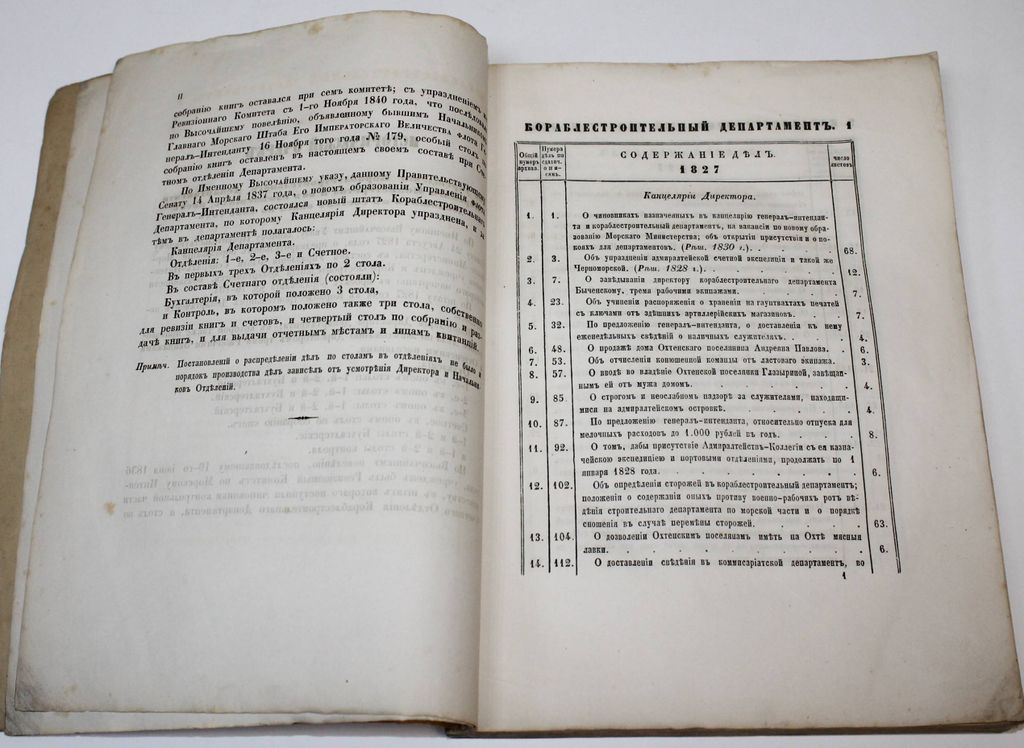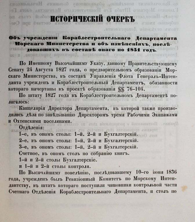 Опись делам Кораблестроительного департамента Морского министерства, хранящимся в Главном морском архиве. Часть I. 1827-1850 гг. №1-2442. СПб.: Тип. Морского кадетского корпуса, [185?]. – [2], II, 300 с. Мягкая немая издательская обложка. В подносном футляре, 32.5х26 см. По Высочайшему Указу, данному Правительствующему Сенату 24 августа 1827 года, о предварительном образовании Морского Министерства, в составе Управления флота Генерал-Интенданта, учрежден и Кораблестроительный Департамент, в обязанности которого входило: руководство проектированием, постройкой и ремонтом судов, заведывание хозяйственной частью кораблестроения. Хорошее состояние.