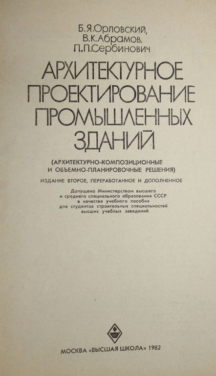 Орловский Б.Я.,Абрамов В.К.,Сербинович П.П. Архитектурное проектирование промышленных зданий. Архитектурно-композиционные и объемно-планировочные решения. М.: Высшая школа. 1982г. 279с.,ил. В книге освещен комплекс вопросов архитектурного проектирования современных промышленных зданий и сооружений. Оосбое внимание обращено на архитектурное проектирование зданий отраслей машиностроения, металлургии, приборостроения, легкой, пищевой, химической, текстильной и строительной промышленности. Приведены объемно-пространственные и планировочные решения этих зданий. Кратко описаны технологические процессы указанных производств. Во второе издание (1-е вышло в 1972 г.) авторы включили крайне необходимое приложение с примером выполнения курсового проекта промышленного здания. Предназначается для студентов строительных вузов и факультетов. Твердый переплет. Энциклопедический формат. Хорошее состояние.