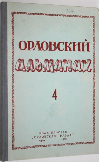 Орловский альманах. Книга четвертая. Орел: Издательство `Орловская правда`, 1952. – 175 с. Твердый переплет. Увеличенный формат. `Орловский альманах` выходил ежегодно с 1949 г. в нем публиковались произведения орловских писателей и поэтов, критика и библиография. В 4-ом выпуске содержится первая публикация автобиографии русского советского беллетриста, драматурга, поэта - Новикова Ивана Алексеевича (1879 - 1959) . Тираж 5000 экз. Отличное состояние.