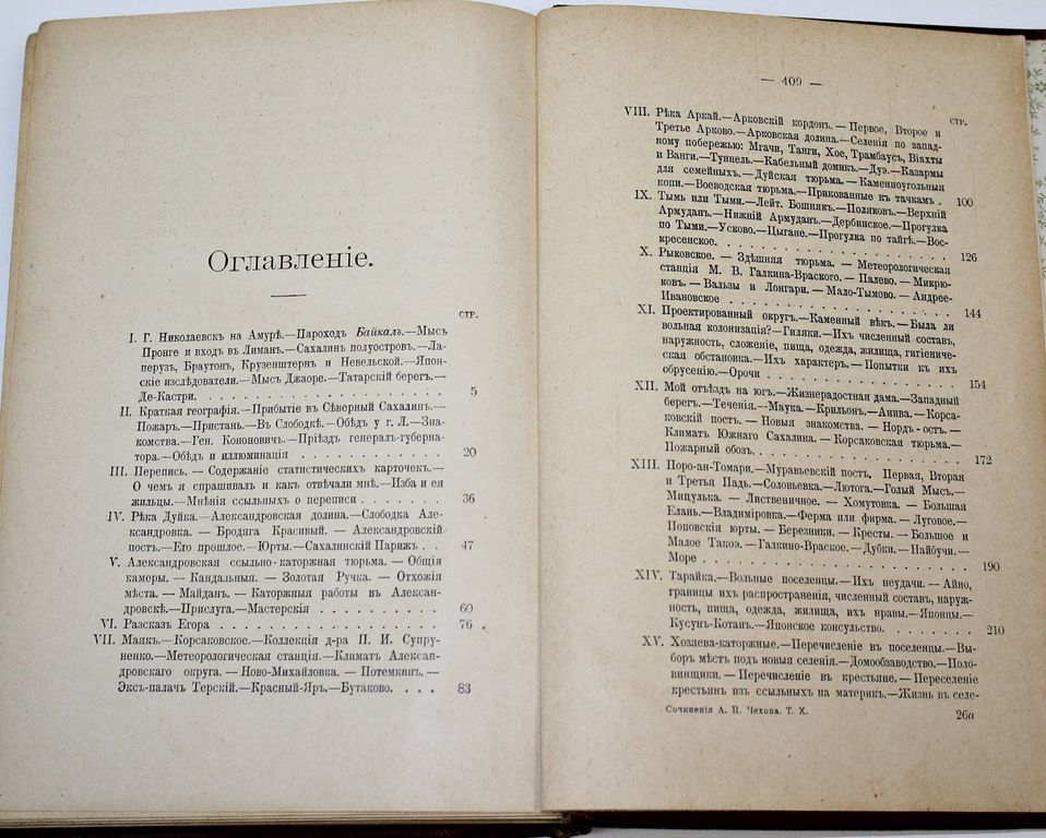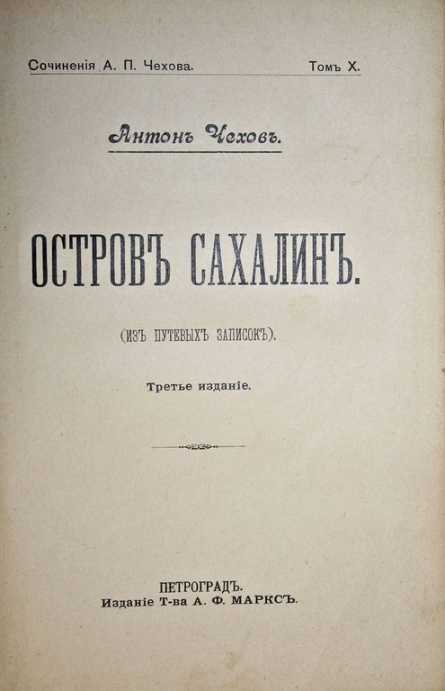 Чехов А. Остров Сахалин (Из путевых записок). Полное собрание сочинений. Том X. 3-е издание. Пг.: Изд. Т-ва А.Ф.Маркс, [1914]. - 410 с. В издательском коленкоровом переплете с красочным тиснением. Обычный формат, 21х15 см. Антон Павлович Чехов (1860-1904) пробыл на Сахалине три месяца – с 10 июля по 13 октября 1890 г. За время, проведенное на острове, писатель проделал колоссальную работу по переписи и обследованию условий жизни каторжан, заполнил около десяти тысяч статистических карточек. Результатами этой поездки явились обострение туберкулезного процесса и беспощадная книга путевых заметок – `Остров Сахалин`. Ее журнальный вариант был опубликован в 1893-1894 гг. В 1901 г. исправленный и дополненный текст составит 10-й том 15-томного `Собрания сочинений А.П. Чехова`, выходившего в издательстве А.Ф. Маркса. Очень хорошее состояние. Незначительные потертости переплета.