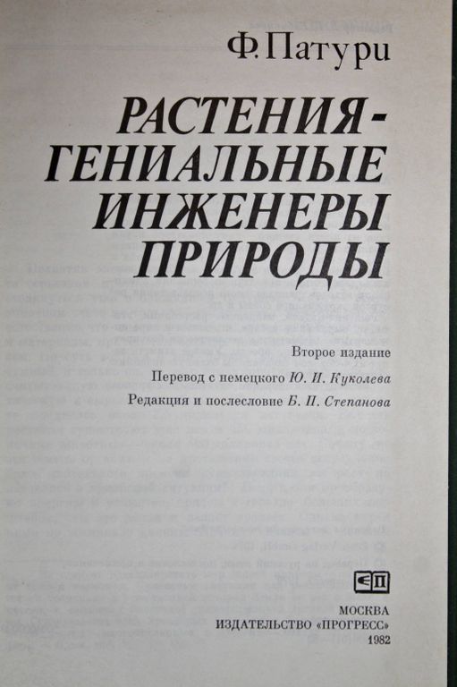 Патури Ф. Растения-гениальные инженеры природы. М.: Прогресс. 1982г. 272с.,ил. *Растения — химики*, *Растения — архитекторы, строители, механики*, *Рекорды измерительной техники*—это названия лишь нескольких глав из книги ученого — популяризатора науки Феликса Р. Патури. Занимательно и со знанием дела рассказывает автор о том, как решаются в мире растений многие проблемы из области апологии, энергетики, передачи информации, утилизации отходов, рационального использования ресурсов окружающей среды и др. Решения-модели, найденные растениями, этими, по выражению автора, *лучшими в мире инженерами*, эффективны, экологически безупречны и одновременно просты. Умелое заимствование их человеком означало бы большую экономию средств и времени. Книга хорошо иллюстрирована.Твердый переплет. Обычный формат. Отличное состояние.