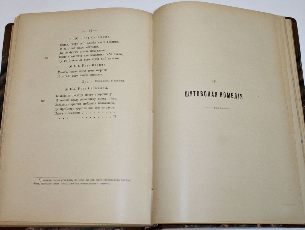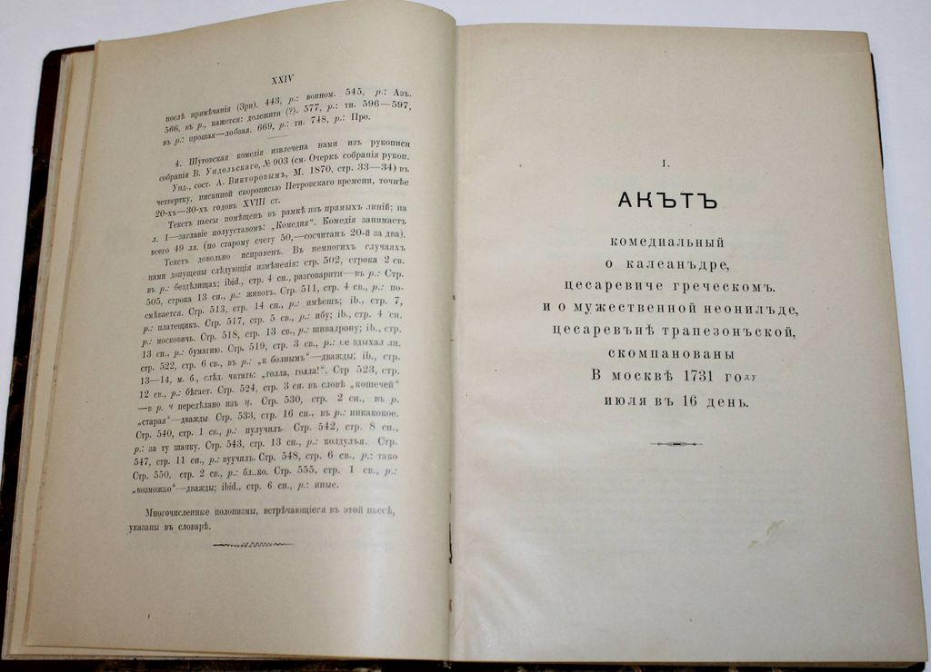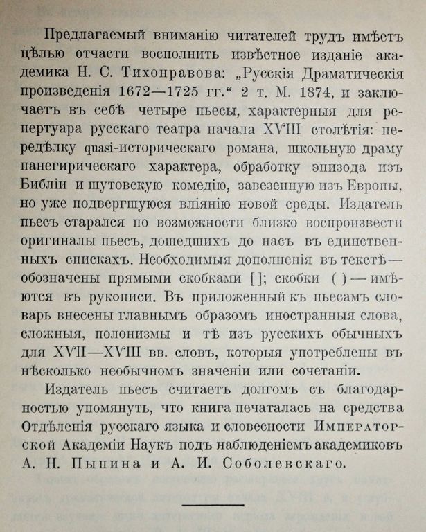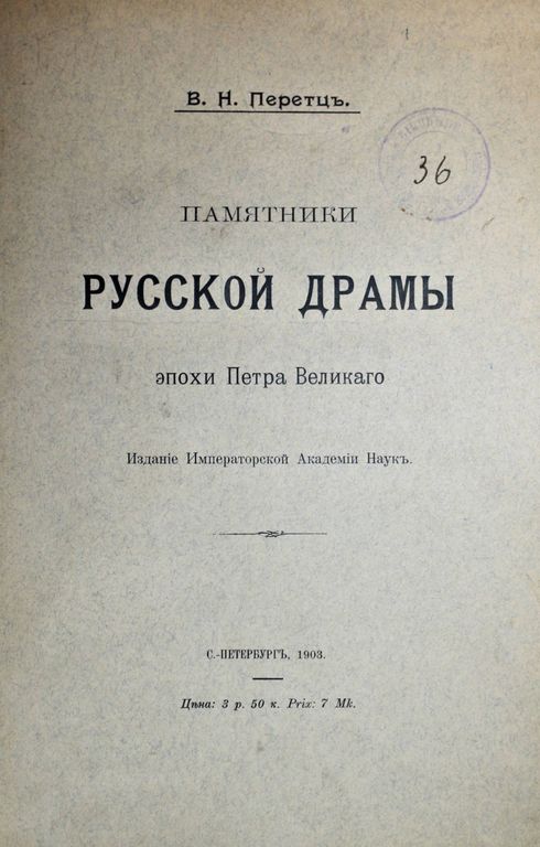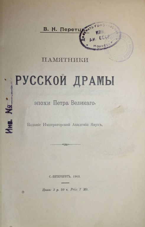 Перетц В.Н. Памятники русской драмы эпохи Петра Великого. Издание Императорской Академии Неук. СПб.: Тип. Вейсберга и Гершунина, 1903. – XXIV, [2], 570 с. В составном переплете эпохи. Мягкие издательские обложки сохранены. Энциклопедический формат, 26.5х19 см. Владимир Николаевич Перетц (1870-1935) - профессор русского языка, выдающийся литературовед и знаток русского театра. Работа В.Перетца предоставляет возможность ознакомиться с историей развития театра во время правления Петра Великого. Из книги можно узнать о редких произведениях драматического жанра, которые ставились на сцене с конца 17 до начала 18 века. Центром внимания Перетца становится досумароковский театр, малоизвестные кружки и коллективы актеров, которые активно функционировали на сцене, но их творчество не получило широкой огласки. Старинный русский театр благодаря стараниям литературоведа вышел из тени, и многие его аспекты оказались достаточно хорошо освещены. Некоторые данные из книги больше нигде не встречаются, а личные наблюдения Перетца являются бесценной находкой для всех поклонников сценических жанров. В издании отражены особенности деятельности кружков при госпитале Бидло, из которых выросли такие таланты, как Дмитриевский, братья Волковы. Автор подробно рассказывает об особенностях репертуара русского театра, о тонкостях выбора произведений для постановки, о связи постановок с политическим строем, культурными нюансами. Хорошее состояние. Незначительная потертость переплета, несколько `мытых` штампов, старые печати `Московской диалектографической комиссии`.