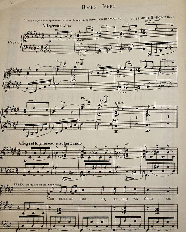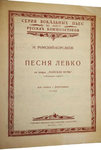 Римский-Корсаков Н. Песня Левко из оперы `Майская ночь` (`Солнышко низко`). Для голоса с фортепиано (тенор). М.: Искусство, 1938. – 10 с.. нот. Очень большой формат. Майская ночь - опера Николая Римского-Корсакова в 3-х действиях, на собственное либретто, по мотивам одноименной повести Н. В. Гоголя. Тираж 3000 экз. Хорошее состояние.