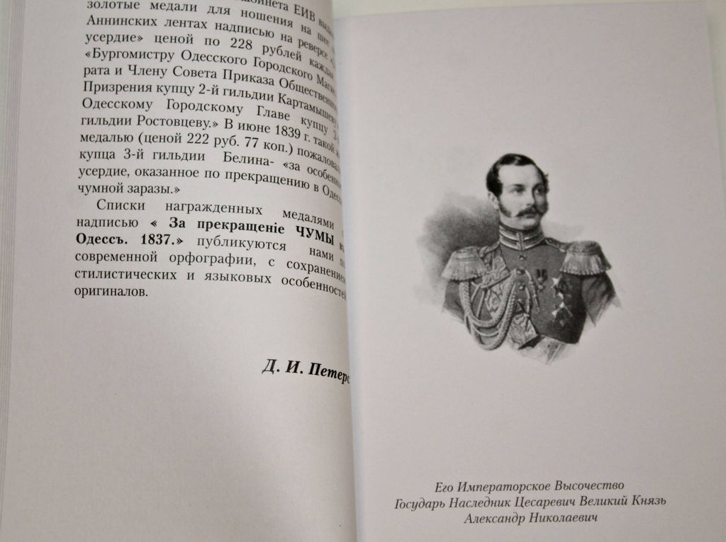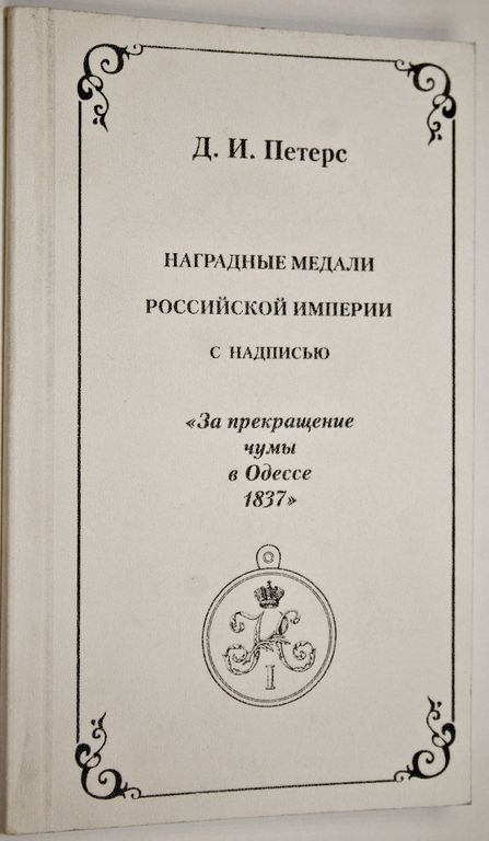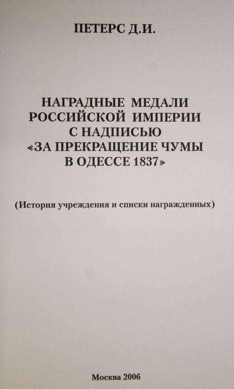 Петерс Д. Наградные медали Российской Империи с надписью `За прекращение чумы в Одессе 1837`. М.: Древлехранилище. 2006 г. 94 с.,ил. Наградные медали Российской империи с надписью на реверсе: `За прекращение чумы в Одессе. 1837` очень редки и подлинные экземпляры в серебре хранятся только в крупнейших нумизматических собраниях страны - Эрмитаже и Историческом музее. Штемпеля описаны в каталоге Санкт-Петербургского монетного двора Смирнова. Тираж 100 экз. Мягкий переплет. Обычный формат. Хорошее состояние.