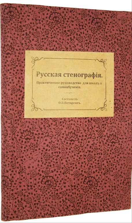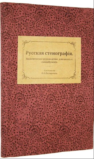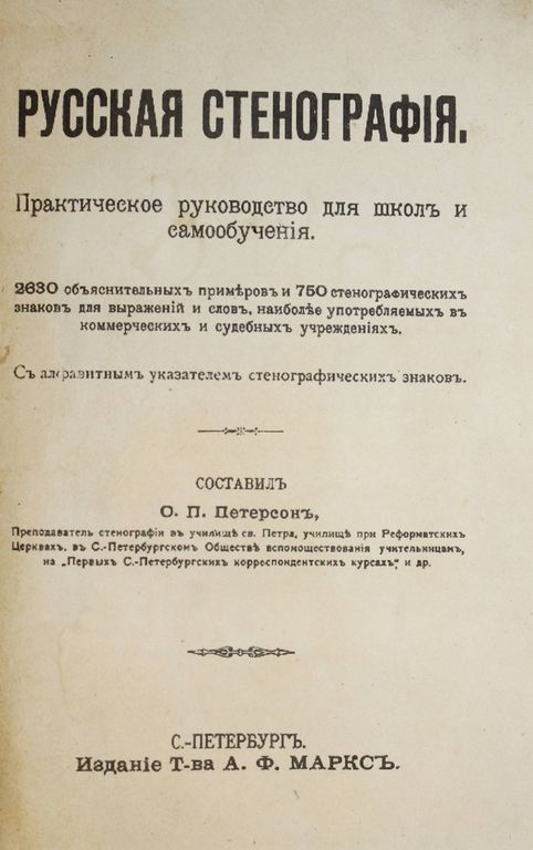 Петерсон О.П. Русская стенография. Практическое руководство для школ и самообучения. 2630 объяснительных примеров и 750 стенографических знаков для выражений и слов, наиболее употребляемых в коммерческих и судебных учреждениях. СПб.: Изд. Т-ва А.Ф.Маркс, [1904]. – 138 с. Во владельческом цельнотканевом переплете с ярлыком на верхней крышке. Обычный формат, 20.5х14 см. Отто Петрович Петерсон - преподаватель стенографии в училище Св. Петра, в училище при Реформатских церквах, в С.-Петербургском Обществе вспомоществования учительницам, на `Первых С.-Петербургских корреспондентских курсах` и др. Хорошее состояние.