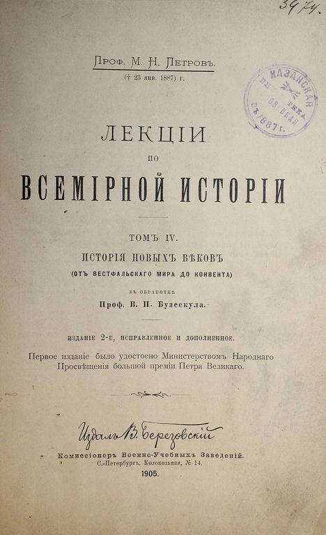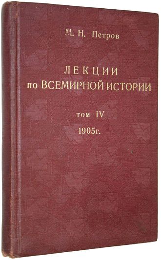 Петров М.Н. Лекции по всемирной истории. Том IV: История новых веков (от Вестфальского мира до Конвента). СПб.: В.Березовский, 1905. – X, 248 с. Твердый переплет с золотым тиснением на верхней крышке. Мягкие издательские обложки сохранены в переплете. Энциклопедический формат, 25х17.5 см. Михаил Назарович Петров (1826—1887) - русский историк. Его `Лекции по всемирной истории` были удостоены Министерством народного просвещения `Большой премией имени императора Петра Великого`. Хорошее состояние. Дореволюционные штампы.