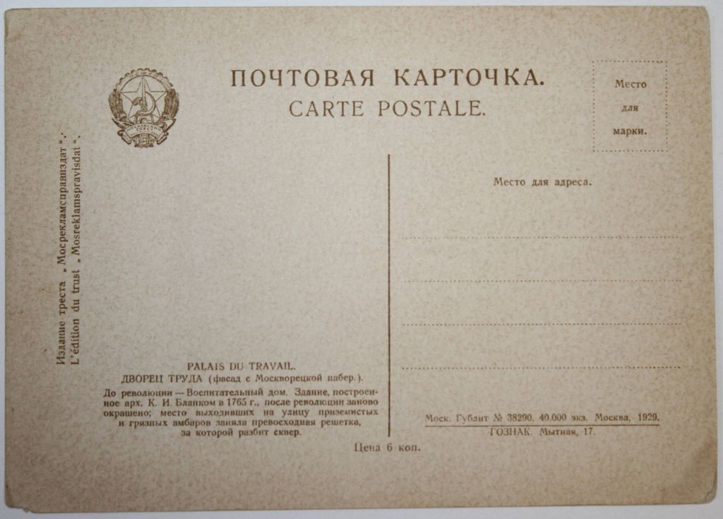 Почтовая карточка. Дворец труда (Фасад с Москворецкой набер.) 250 руб. В корзину Описание Описание Почтовая карточка. Дворец труда (Фасад с Москворецкой набер.)
