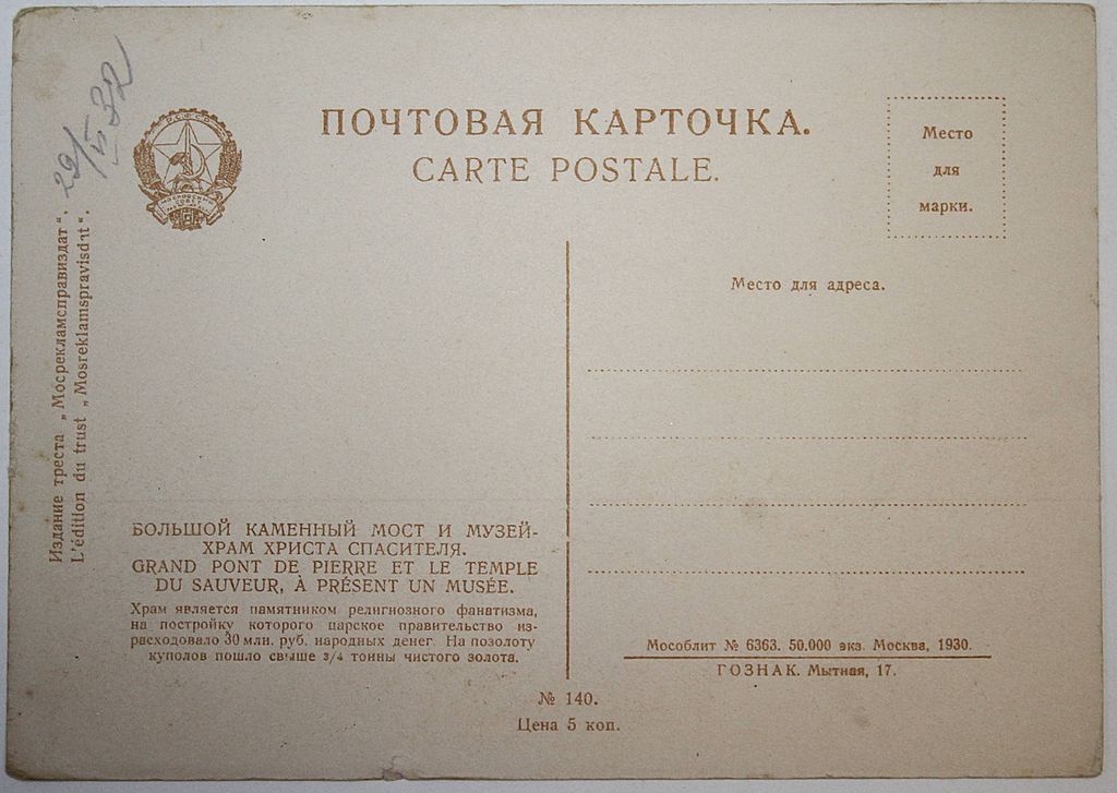 Почтовая карточка. Большой Каменный мост и музей-храм Христа Спасителя. 250 руб. В корзину Описание Описание Почтовая карточка. Большой Каменный мост и музей-храм Христа Спасителя. Вас также может заинтересоватьВ корзинуСеверов Н.П., Чубинашвили Г.Н. Кумурдо и Никорцминда. Вып. I. Памятники грузинской архитектуры. М.: Издательство Академии архитектуры СССР, 19473 500 ₽ В корзину