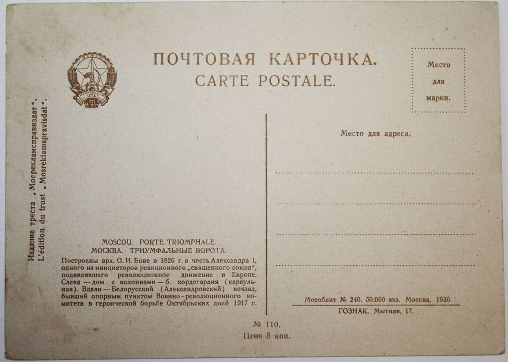Почтовая карточка. Москва. Триумфальные ворота. 250 руб. В корзину Описание Описание Почтовая карточка. Москва. Триумфальные ворота. Вас также может заинтересоватьВ корзинуКузнецов Н. Правильное лесное хозяйство. М.: Издательство Народного Комиссариата Земледелия, [1919].400 ₽ В корзинуВ корзинуМихайловский Г. Средиземноморские отложения Томаковки и положение их в ряду средне-миоценовых образований России и Кавказа. СПб.: Типография М.Стасюлевича, 1903.3 000 ₽ В корзину