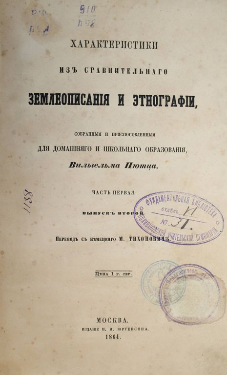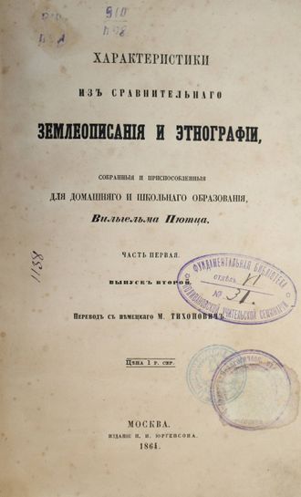 Пютц В. Характеристики из сравнительного землеописания и этнографии, собранные и приспособленные для домашнего и школьного образования. Вып. 2. Пер. с нем. М.Тиханович. М.: Изд. П.И.Юргенсона, 1864. – 278-556, [2] с. Полукожаный переплет. Увеличенный формат, 24.5х16.5 см. ``Преподаватель, имеющий под рукою весьма ограниченное число сочинений по части научного землеописания, может почерпать отсюда материал для более обширного преподавания предмета, кратко изложенного в учебнике; с другой стороны, ученик найдет здесь: оживленное дополнение своих уроков в форме, доступной его пониманию``. Хорошее состояние. Реставрация корешка, старые дореволюционные и советские штампы.
