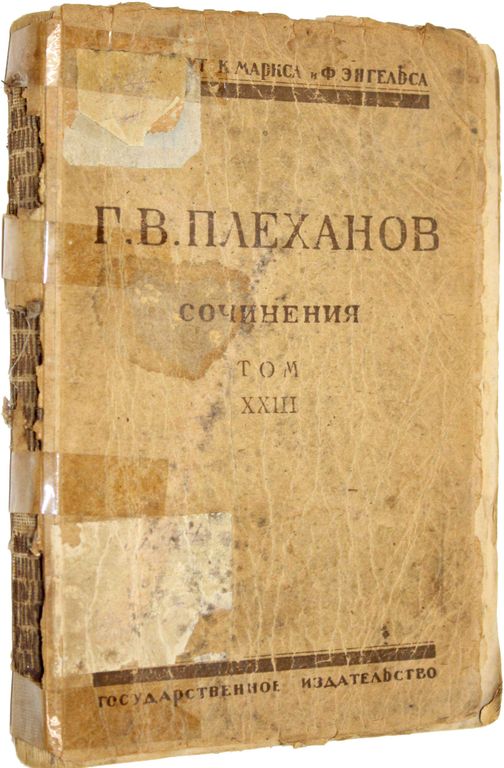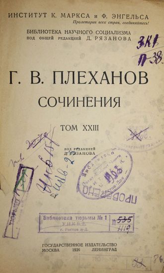 Плеханов Г.В. Сочинения в 24 томах. Том XXIII. Под ред. Д.Рязанова. М.-Л.: Госиздат, 1926. – 460 с. Картонажный издательский переплет. Увеличенный формат, 22х15.5 см. Георгий Валентинович Плеханов (1856 -1918), теоретик и пропагандист марксизма, философ, видный деятель российского и международного социалистического движения. Издание сочинений Плеханова к 1925 году стало настоятельной потребностью, поскольку работы явились богатейшим источником для ознакомления с теорией и практикой марксизма. Плохое состояние. Обложки отделены. Отсутствует корешок, старые библ. штампы исправительных учреждений.