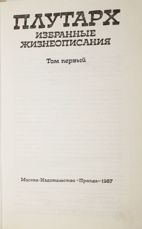 Плутарх. Избранные жизнеописания в 2-х томах. Перевод с древнегреческого. Сост., вступит. статья и примеч. М. Томашевской. М.: Правда. 1987г. 592с.+608 с. Древнегреческий писатель Плутарх (ок. 46-120 г. н.э.) получил всемирную известность благодаря Сравнительным жизнеописаниям - биография знаменитых людей от мифических времен и до своего времени. В настоящее издание включены биографии, представляющие наибольший интерес для широких кругов читателей и сохранившие свою литературную и историческую ценность. Твердый переплет. Обычный формат. Хорошее состояние.