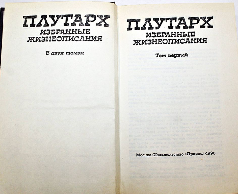 Плутарх. Избранные жизнеописания. В двух томах Пер.с древнегреч. Сост. М.Томашевской. М.: Правда. 1990г. 592с. + 608 с. Древнегреческий писатель Плутарх получил всемирную известность благодаря «Сравнительным жизнеописаниям» — биографиям знаменитых людей от мифических времен и до своего времени. В настоящее издание включены биографии, представляющие наибольший интерес для широких кругов читателей и сохранившие свою литературную и историческую ценность. Твердый переплет. Обычный формат. Хорошее состояние.