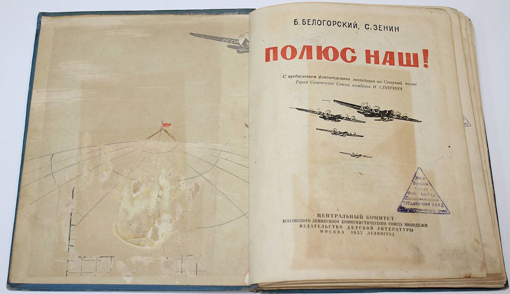 Белогорский Б., Зенин С. Полюс наш! С педисловием флагштурмана экспедиции на Северный полюс Героя Советского Союза комбрига И. Спирина. М.-Л.: Детгиз, 1937. – 264 с., ил., 2 л. ил. Твердый издательский переплет. Обычный формат, 21х17.5 см. Книга для детей старшего возраста об экспедиции к Северному полюсу в 1936 г. под руководством И.Д.Папанина. Книга прекрасно иллюстрирована - многочисленные архивные фотографии летчиков, полярников, экспедиционных моментов. В Приложении - очерки известного полярного исследователя и ученого Н.Н.Зубова: `Страницы из истории борьбы за Северный полюс` и `На дрейфующих льдах`. Удовлетворительное состояние. Небольшие потертости и загрязнения переплета, утрата переднего свободного форзаца, с. 123-124, 177-192, 203-204, 247-250, 256-262, штампы `Трудколонии НКВД`.
