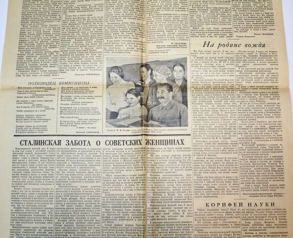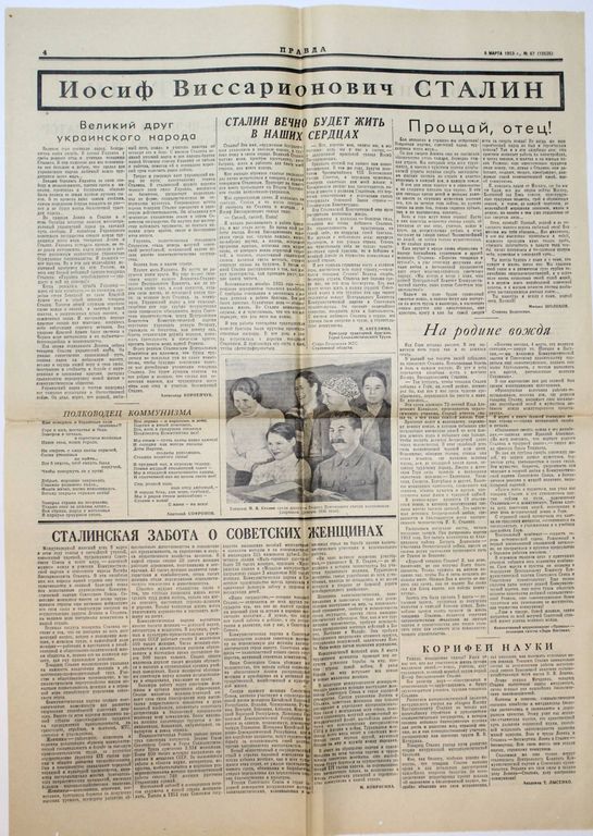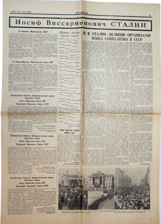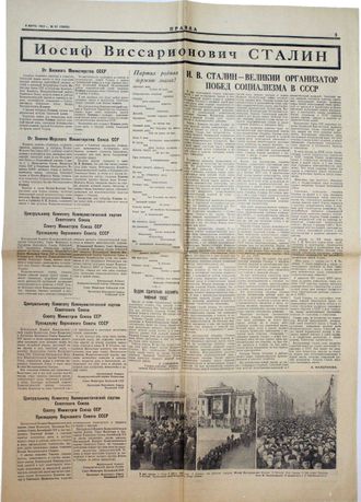 [Похороны И.В. Сталина]. Газета Правда. № 67 за 8 марта 1953 г. Орган Центрального Комитета коммунистической партии Советского союза. М.: Правда, 1953. – 2 с. Очень большой формат, 60х42 см. Выпуск газеты `Правда`, посвященный смерти И.В. Сталина. Хорошее состояние. В наличие только центральный лист.
