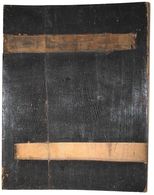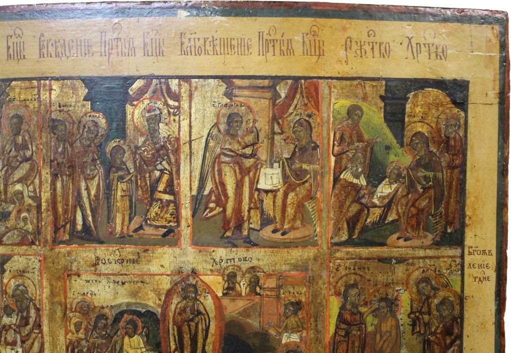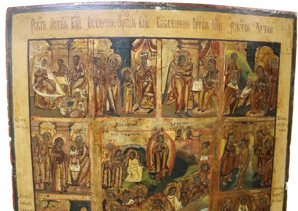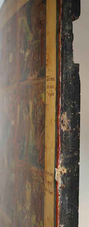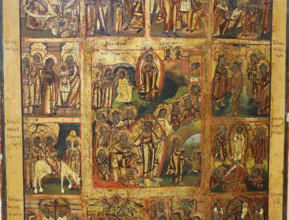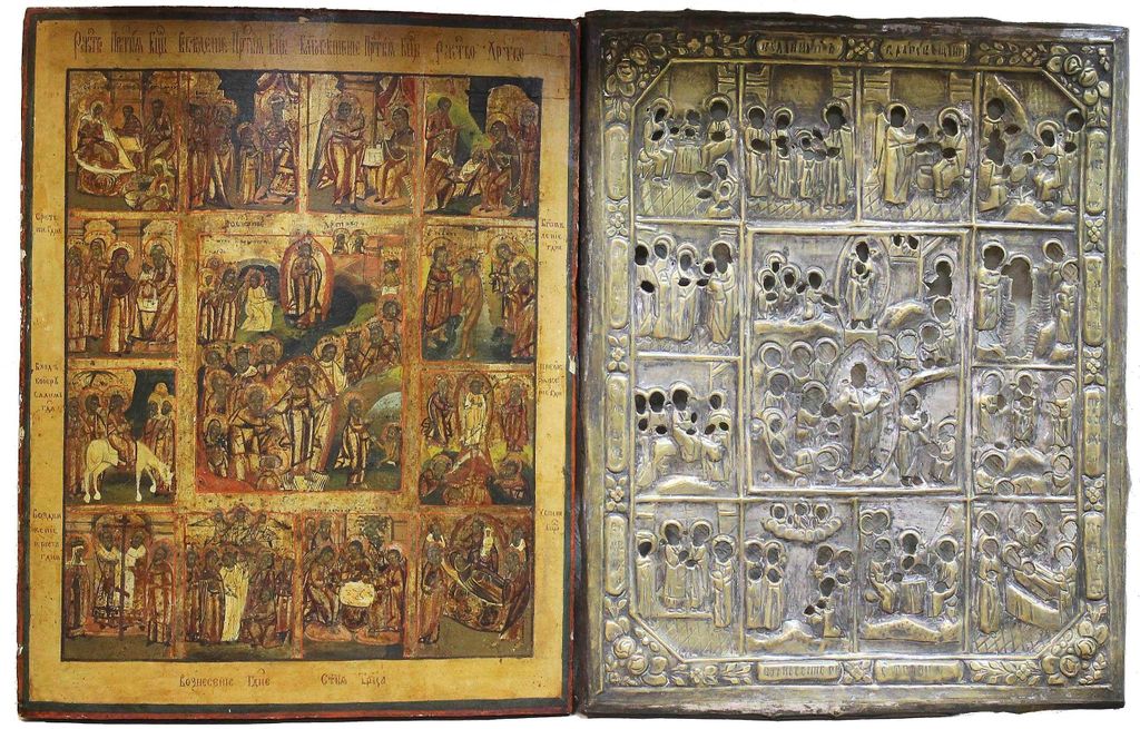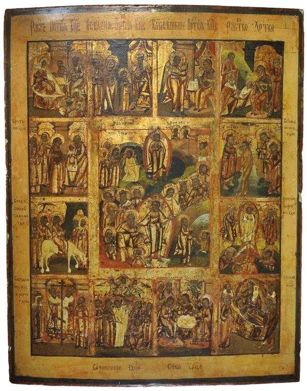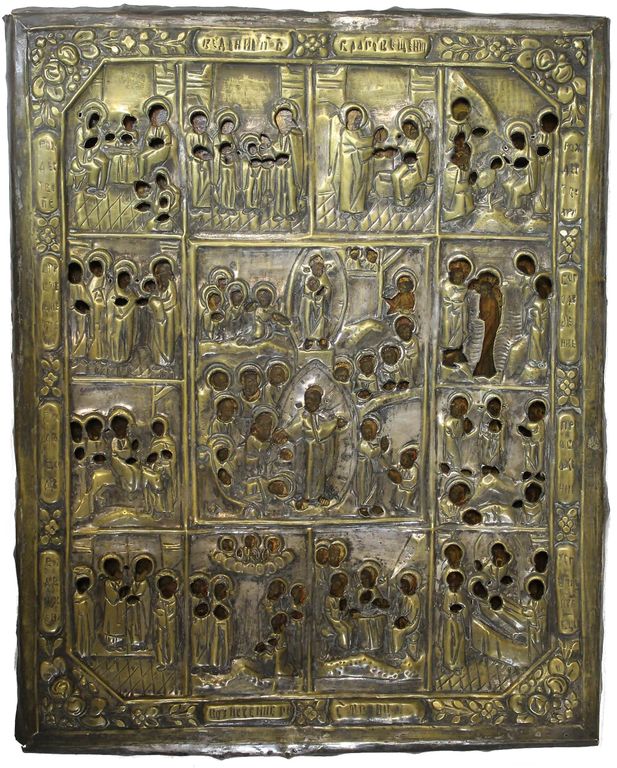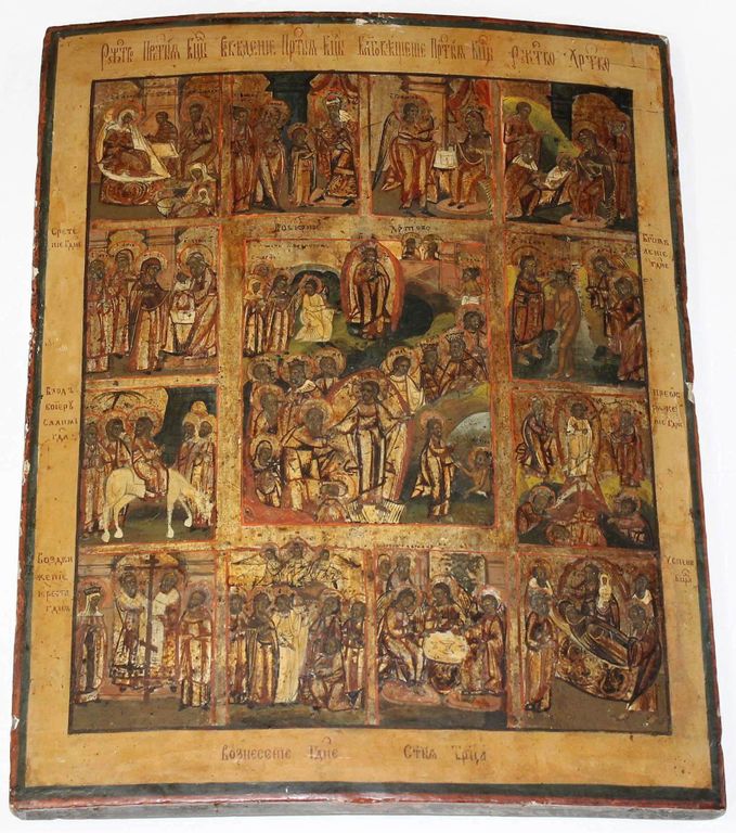 Икона `Воскресение Христово с Двунадесятыми Праздниками`. Россия. Конец XIX в. Дерево, левкас, темпера, золочение. Размер: 49.5 х 39 см. Латунный оклад (не закреплен к доске). Встречные шпонки утрачены. Хорошее состояние. Незначительные следы бытования, доска крепкая. На тыльной стороне плохо читаемые владельческие надписи.