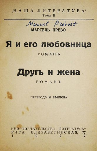 Прево Марсель. Я и его любовница; Друг и жена. Романы. Пер. И.Ефимова. (Серия: `Наша литература`. Том II). Рига: Книгоиздательство `Литература`, 1927. – 214, [2] с. Твердый владельческий переплет. Обычный формат, 18.5Х12.5 см. Эжен Марсель Прево (1862- 1941) — французский писатель и драматург. Основной темой его творчества является бытописание и критика жизни современного ему французского богемного общества. Настоящая книга представляет собой конволют из двух романов писателя. Прижизненное издание. Хорошее состояние.