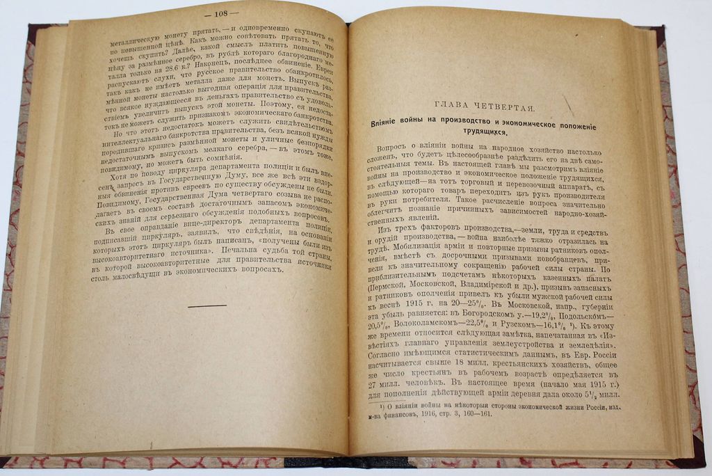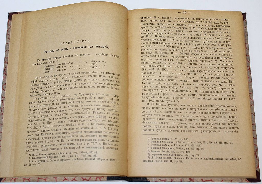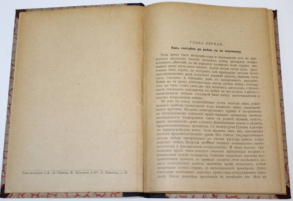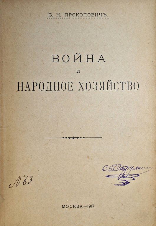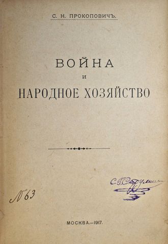 Прокопович С. Н. Война и народное хозяйство. М.: `Дело`, 1917. – 214, [2] с. Владельческий составной переплет. Увеличенный формат, 23х16 см. Сергей Николаевич Прокопович (1871-1955) – российский экономист, масон, руководитель ложи; министр Временного правительства. В настоящем издании исследована экономика Первой мировой войны, ее экономические факторы и их влияние на народное хозяйство. Показаны расходы на войну и источники их покрытия. Изучена внешняя торговля в военный период и падение курса рубля. Автор выявляет влияние войны на разные хозяйственные сферы, в том числе на производство и экономическое положение трудящихся, на транспорт, кредит и торговлю. Значительное внимание он уделяет экономическим перспективам в послевоенный период. /// Из библиотеки Станислава Густавовича Струмилина (1877-1874) - советский экономист и статистик, академик Академии наук СССР; один из авторов пятилетних планов индустриализации СССР. Хорошее состояние. Экслибрис на титульном листе, инвентарный номер.