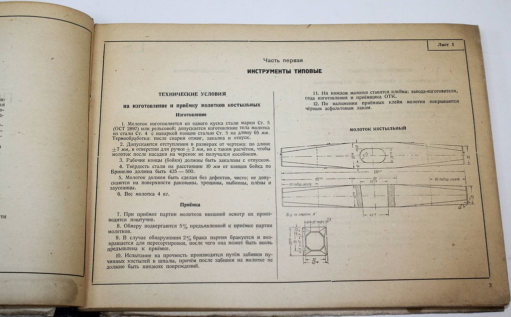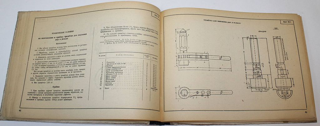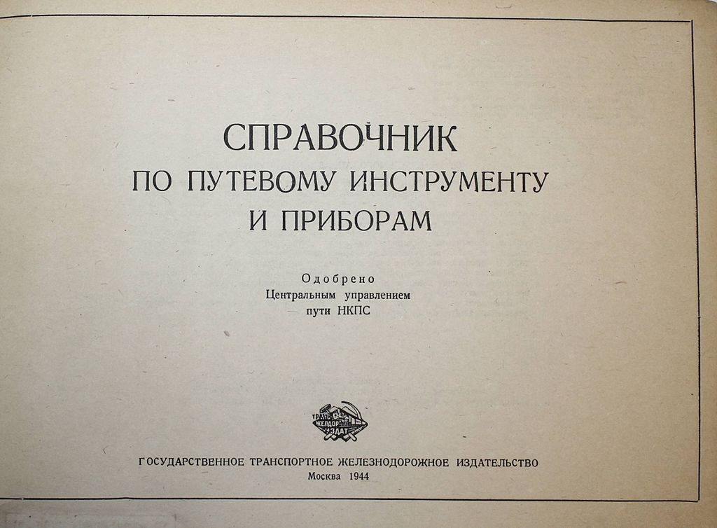Справочник по путевому инструменту и приборам. Авт.-сост.: инж. Д.М.Герцик, П.А.Грибунин, А.Н.Рейхарт. М.: Трансжелдориздат, 1944. – 200 с., ил. Твердый издательский переплет. Энциклопедический формат, 30х22.5 см. В альбоме приведены рабочие чертежи с техническими указаниями на изготовление и приёмку путевого инструмента, измерительных приборов и простейших, широко применяемых транспортных средств. Рассчитан на путейских работников, связанных с изготовлением стандартных инструментов в линейных мастерских и кузницах железнодорожного транспорта. Хорошее состояние. Небольшая потертость переплета, следы `мытых` штампов.