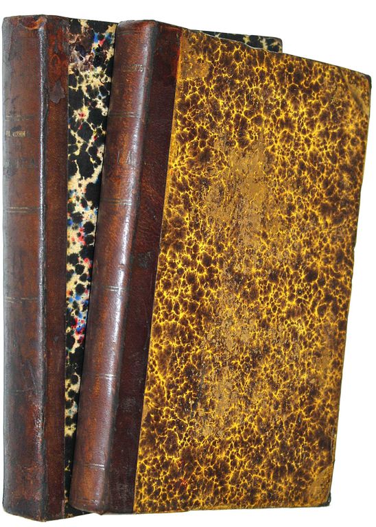 Рагозин В. Волга. [в 3 т.]. Том 1: От истока до Оки; Том 3: От Оки до Камы: О народах по средней Волге. Исторический очерк. СПб.: Тип. К.Ритгер, 1880-1881. – [4], IV, 388, VIII, [2] с., ил., 9 л. ил.; [8], 496 с., 10 л. ил. В двух полукожаных переплетах. Энциклопедический формат, 25х17 см. Фундаментальный труд, посвященный историко-географическому и естественнонаучному описанию Волги инженера и предпринимателя, нефтепромышленника, писателя Виктора Ивановича Рагозина (1833-1901). Он распоряжался строительством барж, заготовкой дров, устраивал склады топлива, формировал караваны грузов, держал в памяти огромное количество их маршрутов, названий судов и фирм. На простой лодке он обошел всю Волгу от Рыбинска до низовий, знал ее всю - от гидрогеологии до этнографии. Хорошее состояние. Незначительная потертость переплетов, следы `мытых` штампов.