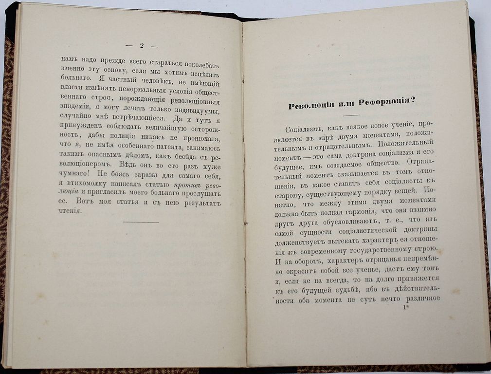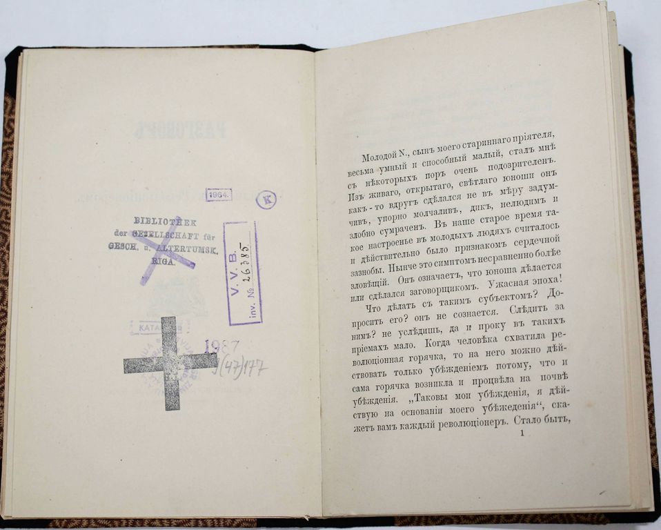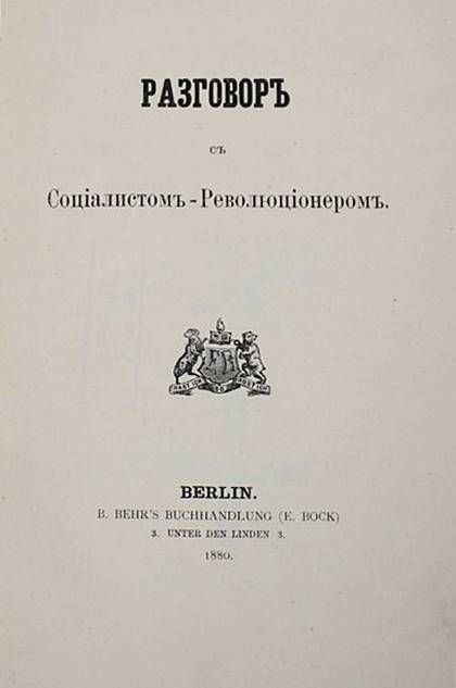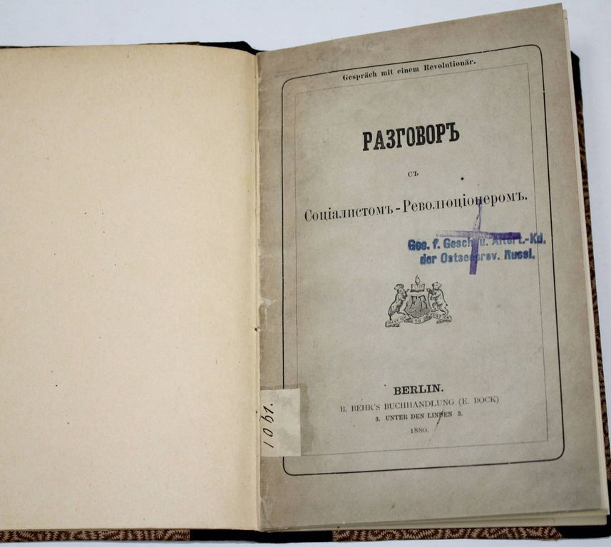 Кавелин К.Д. Разговор с Социалистом – Революционером. Berlin: B. Behr`s buchhandlung (E. Bock), [Типография Станкевича], 1880. – [4], 52 с. Твердый цельнотканевый владельческий переплет, мягкие издательские обложки сохранены. Обычный формат, 18.5х12.5 см. Прижизненное издание. Константин Дмитриевич Кавелин (1818–1885) – историк, философ, правовед, публицист и мемуарист, один из самых крупных и влиятельных русских мыслителей 1840–1880-х гг. В статье `Разговор с социалистом-революционером` Кавелин формулирует идею о том, что русский народ `стремится к осуществлению своего исторического идеала не в грубой конституционной борьбе большинства с меньшинством, но в общинном единогласии под эгидой самодержавной власти`. Библиография: Вольная русская печать. Пб., 1920. Хорошее состояние. Погашенные штампы иностранной библиотеки.
