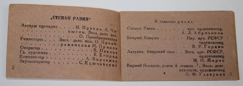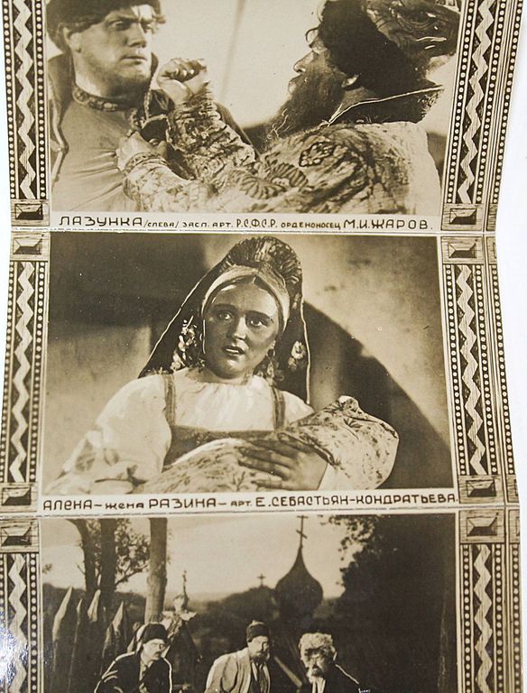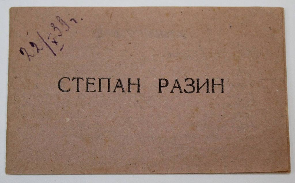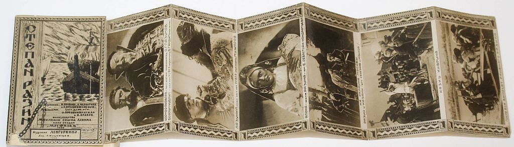 `Степан Разин`. Реж. О.Преображенская, И.Правов. Миниатюрный фотоальбом-раскладушка к фильму. Худ. Г.Кузнецов. Л.: Ленгоркнига, 1939. – 16 с., 7 фото. Формат, 8х6 см. `Степан Разин` - советский чёрно-белый полнометражный художественный фильм 1939 года. Экранизация романа Алексея Чапыгина. Хорошее состояние.