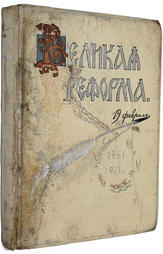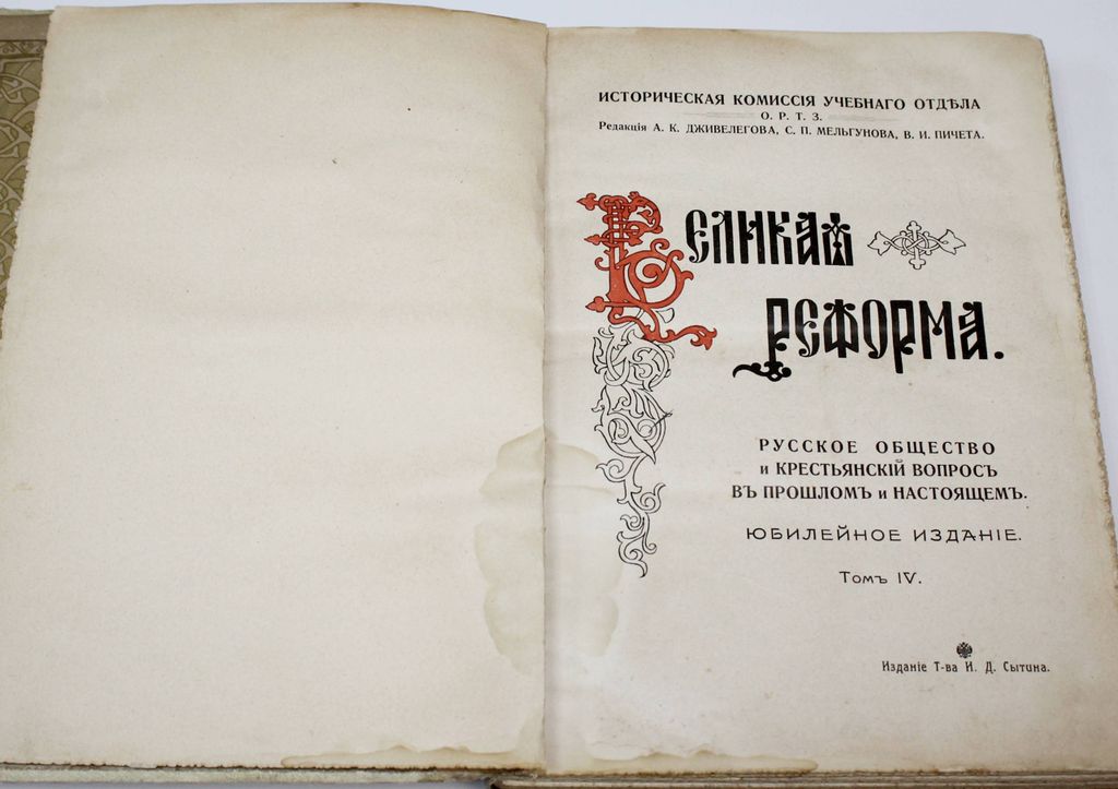 Великая реформа. Русское общество и крестьянский вопрос в прошлом и настоящем. Юбилейное издание. [В 6 т.] Том 4. М.: Издание И.Д.Сытина, 1911. – [4], 280 с., ил., 20 л.ил. Издательский переплет, торшонированный обрез, защитные кальки. Энциклопедический формат, 29х21.5 см. Выпущенное к 50-летнему юбилею отмены крепостного права И.Д. Сытиным, знаменитое собрание исследований русских историков и экономистов о крестьянском вопросе. Издание стало знаковым в истории научной и общественной мысли и в истории русского книжного дела. Удовлетворительное состояние. Потертости и небольшие загрязнения переплета, форзацы подклеены бумагой, утрата 3 л. ил.