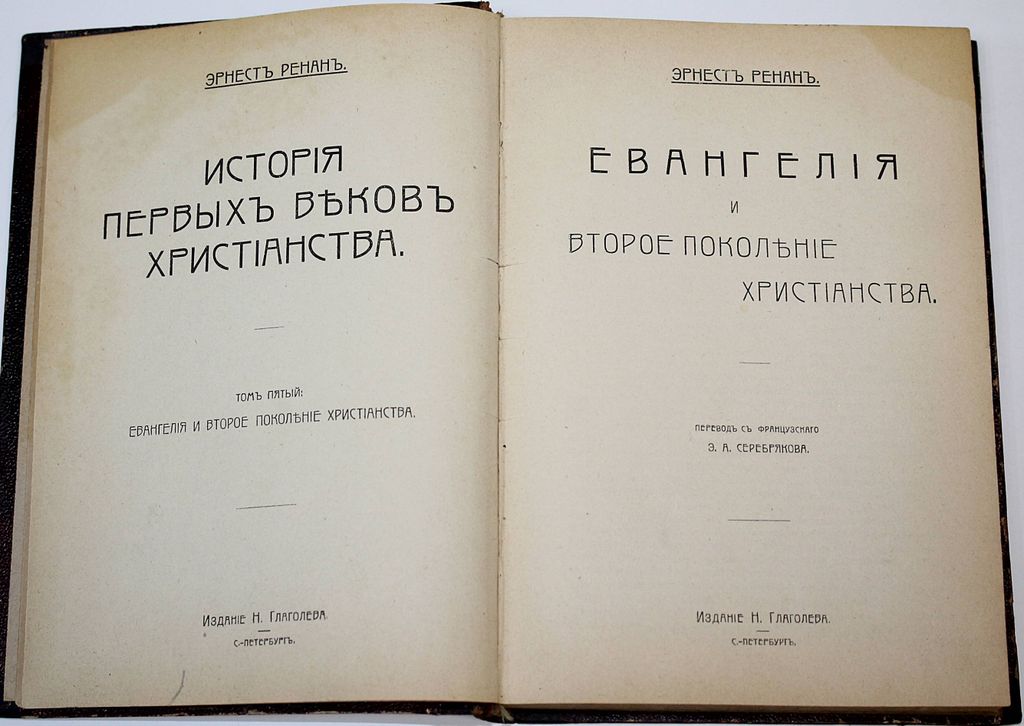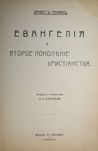 Ренан Э. История первых веков христианства. Том 5: Евангелие и второе поколение христианства. Перевод с фр. Э.А.Серебрякова. СПб.: Изд. Н.Глаголева, [1907]. – 310, [2] с. Полукожаный переплет. Обычный формат, 21х15.5 см. Книга известного французского философа, автора ряда семитологических исследований Жозефа Эрнеста Ренана (1823-1892). Произведение стало популярным за счет смешения научного подхода к изучению четырех книг Евангелия и художественной реконструкции жизни Иисуса Христа, позволило читателю по-новому взглянуть на священные тексты. Хорошее состояние. Небольшая потертость переплета.