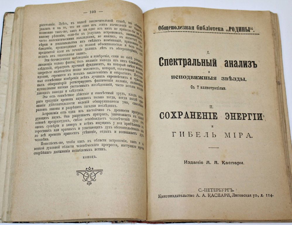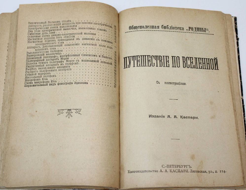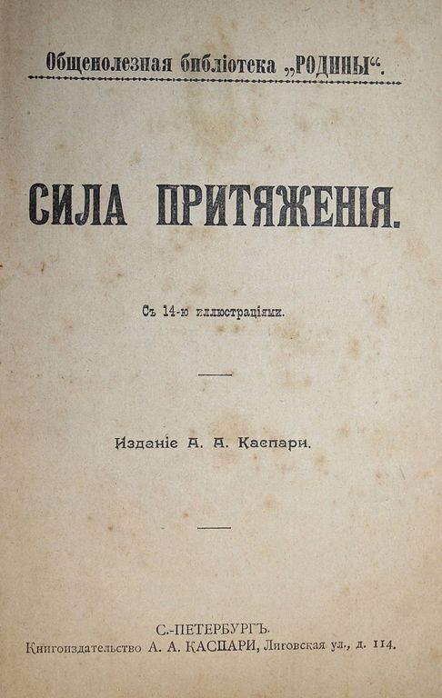 Общественная библиотека `Родины`. Книга 1 - 12. СПб.: Кн-во Каспари, 1906. – 992 с., ил. (разд. пагинации). В 4-х владельческих составных переплетах. Обычный формат, 19.5х13.5 см. В состав комплекта вошли: 1) Сила притяжения. – 80 с., ил; 2) Электричество. – 88 с., ил.; 3) Путешествие во Вселенной. – 160 с., ил.; 4) I. Спектральный анализ и неподвижные звезды; II. Сохранение энергии и гибель мира. – 80 с.; 5) Немного о химии. – 160 с., ил.; 6) О жизни человека, животных и растений. – 424 с., ил. Хорошее состояние. Небольшие потертости переплетов.