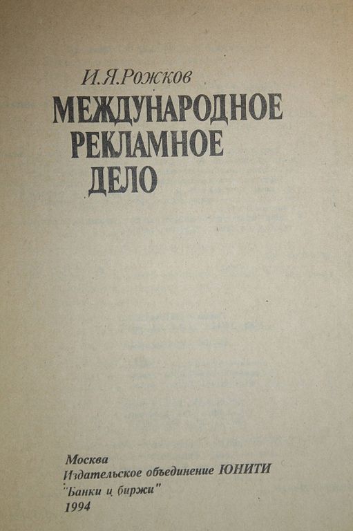 Рожков И.Я. Международное рекламное дело. М.: Банки и биржи; ЮНИТИ. 1994г. 176 с. Рассмотрены опыт рекламы промышленно развитых стран и возможности использования его в условиях формирования рыночных отношений и становления `цивилизованной коммерции` в нашей стране. Впервые реклама рассматривается как комплекс маркетинговых коммуникаций. Показана роль рекламы в стимулировании экспортной деятельности и интеграции российских производственно-сбытовых структур в мировое хозяйство. Мягкий переплет. Обычный формат. Хорошее состояние.