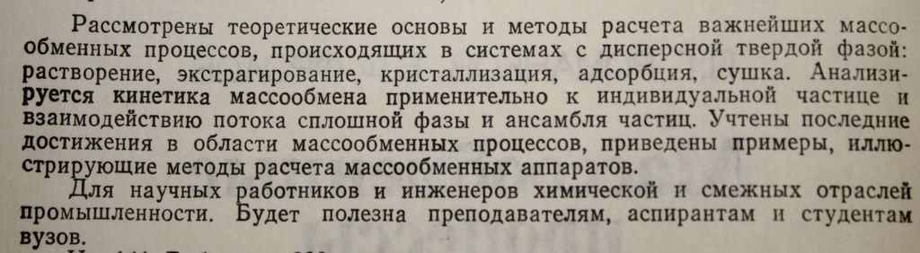 Романков П.Г., Фролов В.Ф. Массообменные процессы химической технологии Серия: Процессы и аппараты химической и нефтехимической технологии. Л.: Химия. 1990г. 384 с. Рассмотрены теоретические основы и методы расчета важнейших массообменных процессов, происходящих в системах с дисперсной твердой фазой: растворение, экстрагирование, кристаллизация, адсорбция, сушка. Анализируется кинетика массообмена применительно к индивидуальной частице и взаимодействию потока сплошной фазы и ансамбля частиц. Учтены последние достижения в области массообменных процессов, приведены примеры, иллюстрирующие методы расчета массообменных аппаратов. Твердый переплет. Увеличенный формат. Хорошее состояние.
