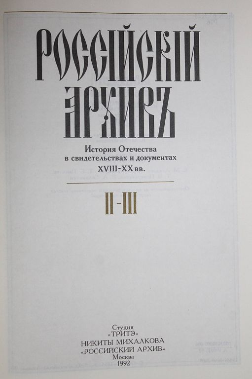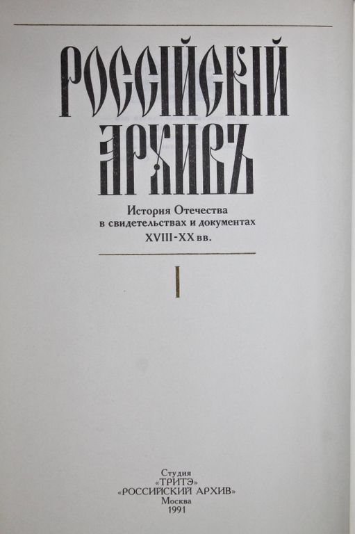 Российский Архив: История Отечества в свидетельствах и документах XVIII-XX вв. Альманах. Выпуск I, II, III. М.: Студия ТРИТЭ. Российский архив. 1991 - 1992г. 464с.,ил.+560 с.,ил. Альманах посвящен неизвестным страницам русской истории. Публикуются документы, хранящиеся в отечественных и зарубежных архивах. В двух твердых переплетах. Увеличенный формат. Отличное состояние.
