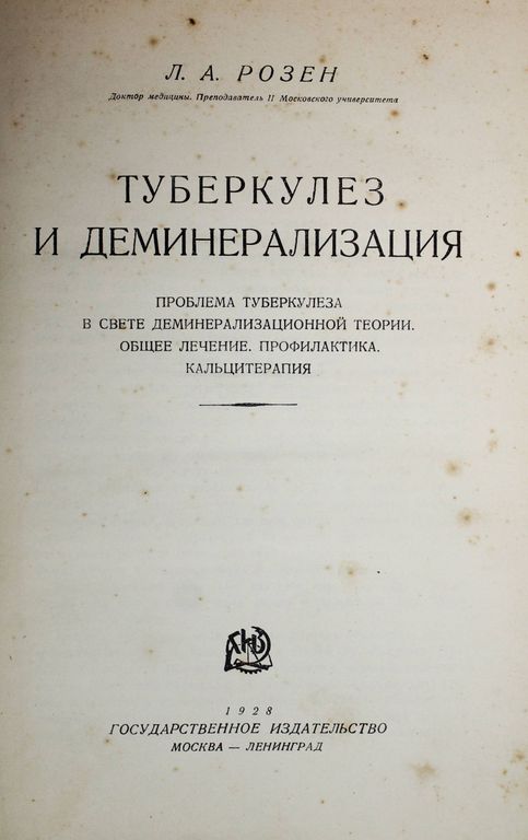 Розен Л.А. Туберкулез и деминерализация. Проблема туберкулеза в свете деминерализационной теории: Общее лечение. Профилактика. Кальцитерапия. М.-Л.: Государственное издательство, 1928. – XX, 606 с. Твердый издательский переплет. Энциклопедический формат, 25х18 см. Хорошее состояние.