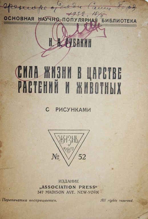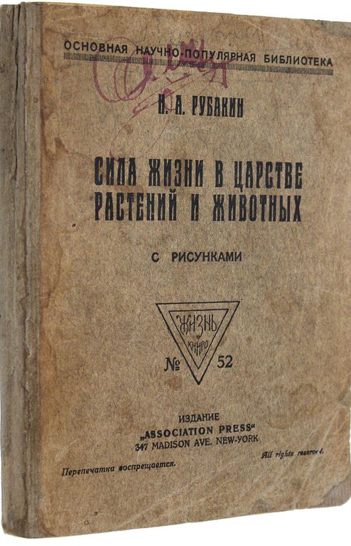 Рубакин Н.А. Сила жизни в царстве растений и животных. С рисунками. Нью-Йорк: `Associatioin`, [1921]. – 493, [3] с., ил. Мягкая издательская обложка. Уменьшенный формат, 17х12 см. Николай Александрович Рубакин (1862 - 1946) - русский библиограф, книговед, популяризатор науки и писатель. Хорошее состояние. Задняя обложка восстановлена, утрачен последний текстовый лист (с. 491-492), владельческие подписи, штампы букинист. магазина.