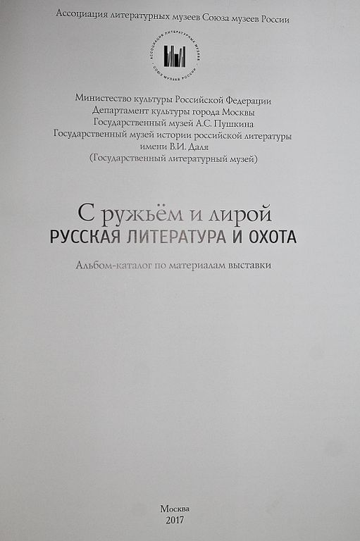 С ружьем и лирой. Русская литература и охота. Альбом-каталог по материалам выставки. Составители: С.П. Белехова, А.Г. Волховская. М.: Государственный музей А.С. Пушкина. 2017г. 188с., ил. Каталог выставки. Выставка открывает широкий взгляд на творчество русских писателей через призму их личных увлечений и охотничьего колорита. Хронологические рамки экспозиции охватывают период от XVIII до ХХ века – от Александра Сумарокова и Гавриила Державина до Виктора Астафьева и Александра Вампилова. Мягкий переплет. Энциклопедический формат. Отличное состояние.