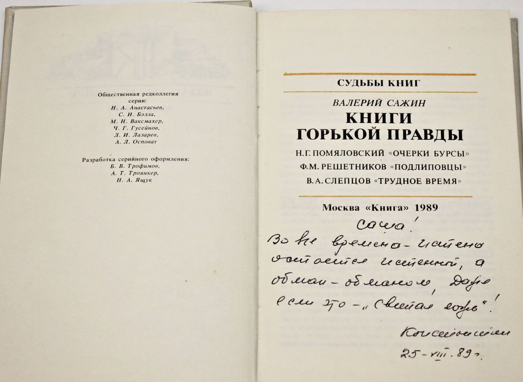Сажин В. Книги горькой правды. М.: Книга. 1985г. 223с. Книга рассказывает о судьбе произведений писателей-разночинцев: Н.Г.Помяловского, Ф.М.Решетникова, В.А.Слепцова. Твердый переплет. Уменьшенный формат. Хорошее состояние, дарствен. надпись.