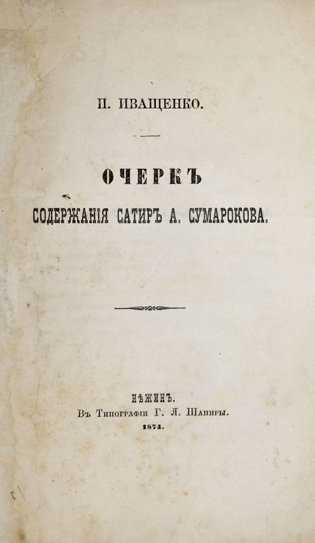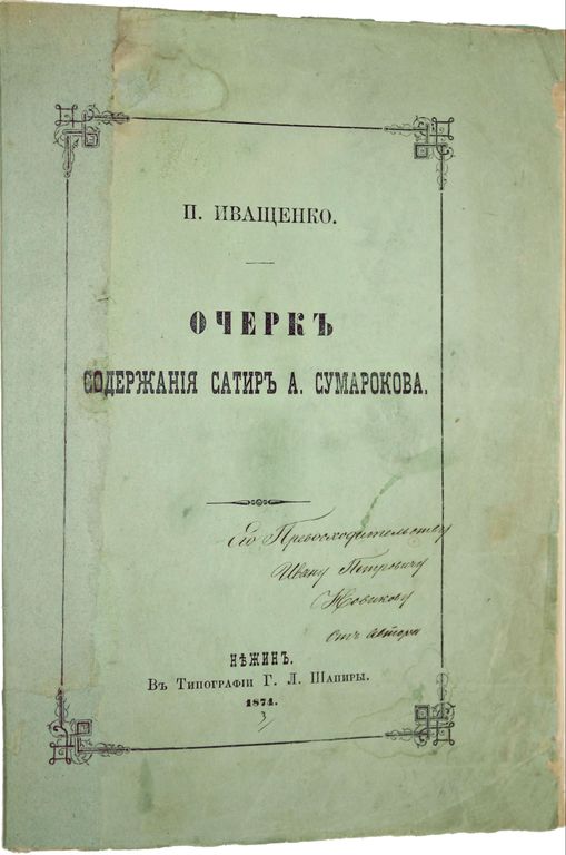 Иващенко П. Очерк содержания сатир А.Сумарокова. Нежин: В Типографии Г.Л.Шапиры, 1874. – 32 с. В шрифтовой издательской обложке. Увеличенный формат, 24х17 см. Пётр Семёнович Иващенко (1846 - 1897) - русский филолог. В 1873 - 1874 году исполнял должность профессора русской словесности в нежинском юридическом лицее. Дарственная надпись от автора Ивану Петровичу Новикову (1824 - 1890) – генерал-лейтенант, попечитель учебного округа сначала в Киеве, а с 1885 года в Санкт-Петербурге. Редкое региональное издание. Хорошее состояние. Реставрация обложки и нескольких страниц.