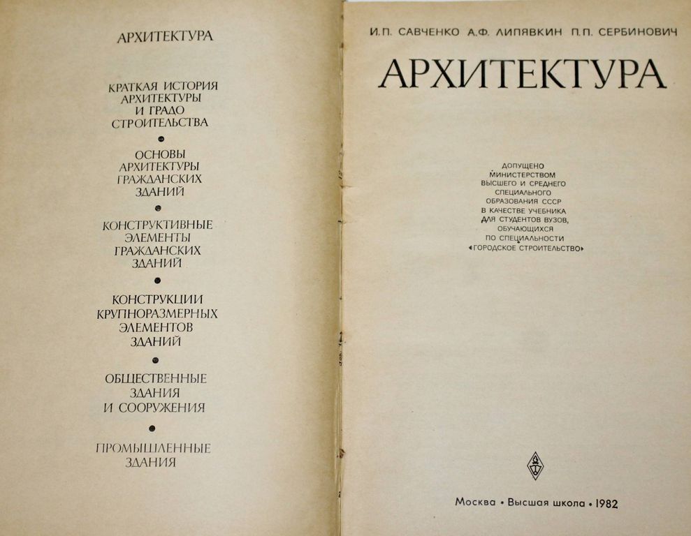 Савченко И.П., Липявкин А.Ф., Сербинович П.П. Архитектура. Учебник для студентов вузов по специальности Городское строительство. М.: Высшая школа. 1982г. 376 с., ил. В первом разделе сделан обзор развития архитектуры и градостроительства в важнейшие исторические эпохи. Во втором - шестом разделах изложены вопросы проектирования жилых, общественных и промышленных зданий, рассмотрены части зданий и их элементы, применяемые в современном городском строительстве. Значительное внимание уделено зданиям театров, гостиниц, автовокзалов, гаражей, бань и т.п., а также малым формам архитектуры. Твердый переплет. Увеличенный формат. Хорошее состояние.