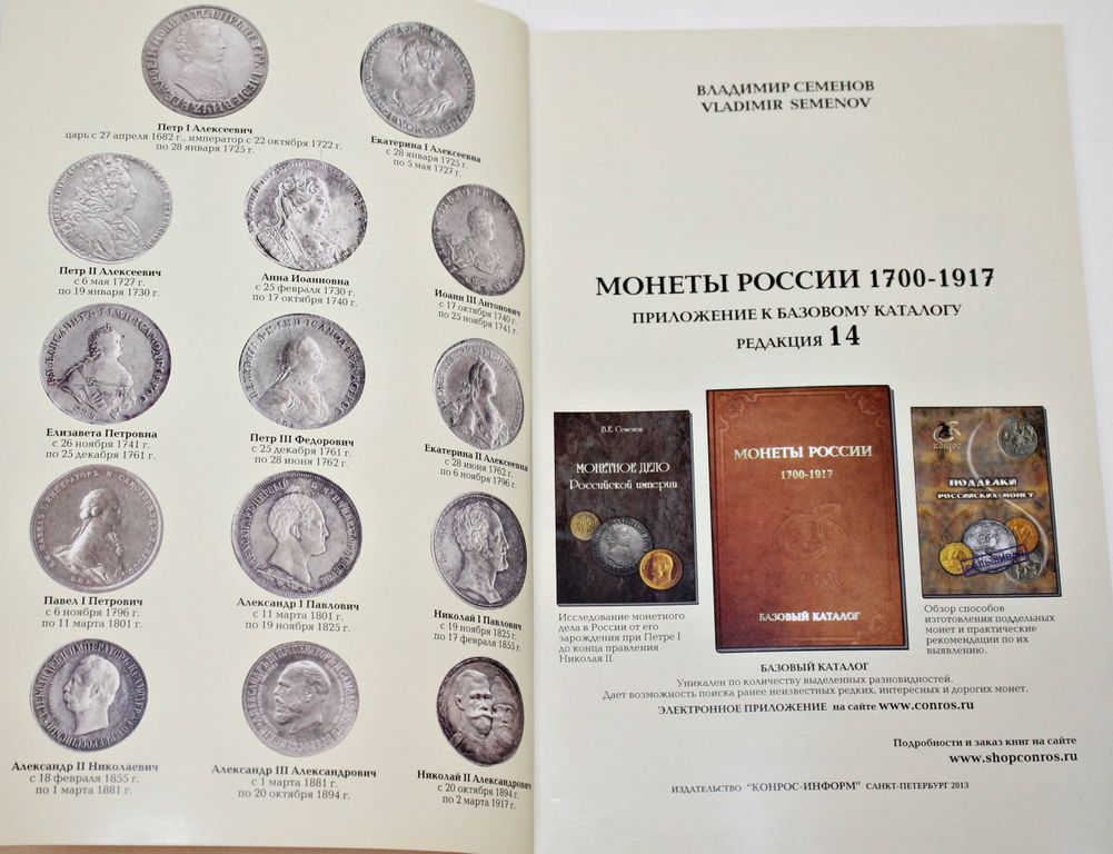 Семенов В. Каталог. Монеты России 1700-1917 гг. Редакция 14. Приложение к базовому каталогу. СПб.: Конрос-Информ. 2013. 240с,,ил. В приложение к каталогу внесены монетные типы,разновидности монет,таблицы редкости монет, их вес и рыночная стоимость. Мягкий переплет. Обычный формат. Отличное состояние.