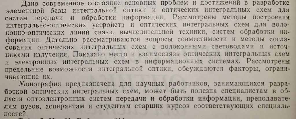 Семенов А., и др. Интегральная оптика для систем передачи и обработки информации. М.: Радио и связь. 1990г. 224с.,ил. В монографии дано современное состояние основных проблем и достижений в разработке элементарной базы интегральной оптики и оптических интегральных схем для систем передачи и обработки информации. Рассмотрены методы построения интегрально-оптических устройств и оптических интегральных схем для волоконно-оптических линий связи, вычислительной техники, систем обработки информации. Детально рассматриваются вопросы совместимости и методы согласования оптических интегральных схем с волоконными световодами и источниками излучения. Показаны место и взаимосвязь оптических интегральных схем в информационных системах. Рассмотрены предельные возможности интегральной оптики, обсуждаются факторы, ограничивающие их. Твердый переплет. Увеличенный формат. Хорошее состояние.