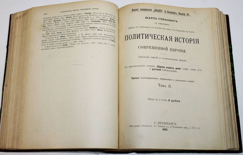 Сеньобос Ш. Политическая история современной Европы. В 2-х томах. Эволюция партий и политических форм. С приложением очерка `Европа наших дней` и русской библиографией. СПб.: Тип. Монтвида, 1903. – [2], IV, 324, [2], VI, 325-840, XI с., 47 л. ил. Два тома в одном владельческом полукожаном переплете эпохи. Увеличенный формат, 22.5х17.5 см. Шарль Сеньобос (1854-1942) – выдающейся французский историк, профессор Сорбонны, создатель нового подхода в изучении истории. Именно в его работах история превратилась в научную дисциплину. В настоящей книге Ш.Сеньобос рассматривает новейший период европейской политической истории, начиная с падения режима Наполеона в 1814 г. Прижизненное издание. Хорошее состояние. Небольшие потертости, `мытые` штампы, форзацы поновлены.