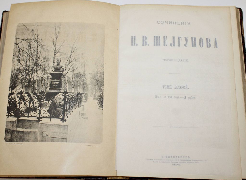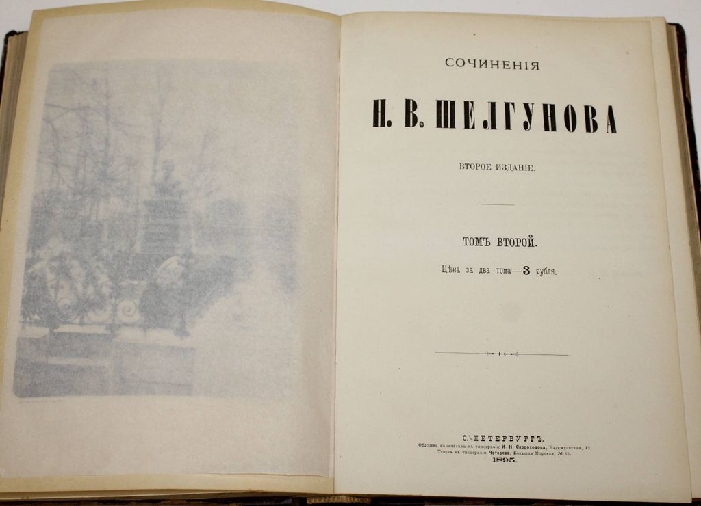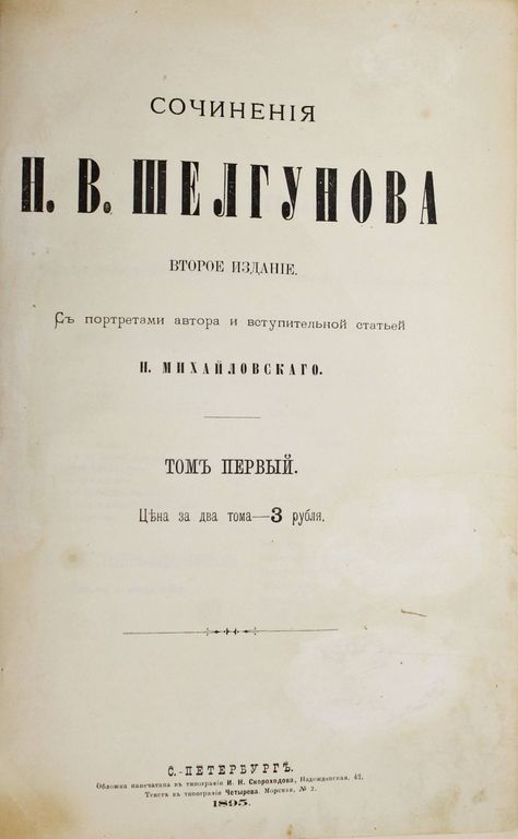 Шелгунов Н.В. Сочинения Н.В.Шелгунова. В 2-х томах. С портретами автора и вступительной статьей Н.Михайловского. Издание второе. СПб.: Типография Четырева, 1895. – LXXXII, 852 стлб., 1 л. ил.; [6] с., 740 стлб., 1 л. ил. В составном владельческом переплете. Защитные кальки. Энциклопедический формат, 27.5х19.5 см. Николай Васильевич Шелгунов (1824- 1891) - русский публицист и литературный критик, учёный-лесовод, участник революционно-демократического движения 1850 - 1860-х годов. В настоящем сборнике помещена только часть творческого наследия Шелгунова. Собранные статьи имеют почти исключительно исторический и научный характер. Хорошее состояние. Незначительная потертость переплета, следы сведения штампов.