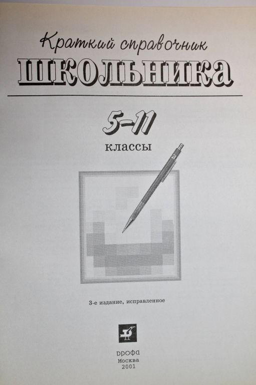 Краткий справочник школьника. 5-11 класс. Автор сост. Алтынов П.И. 3-е изд. М.: Дрофа. 2001г. 624с., ил. Пособие содержит материалы по всем предметам, изучаемым в 5-11 классах общеобразовательных школ. В переработанное в 2004 г. издание вошли новые материалы по географии, истории, английскому языку, информатике. Твердый переплет. Энциклопедический формат. Хорошее состояние.