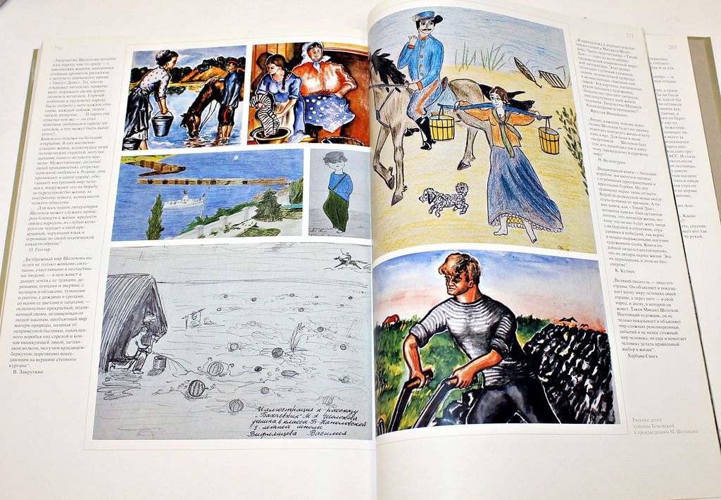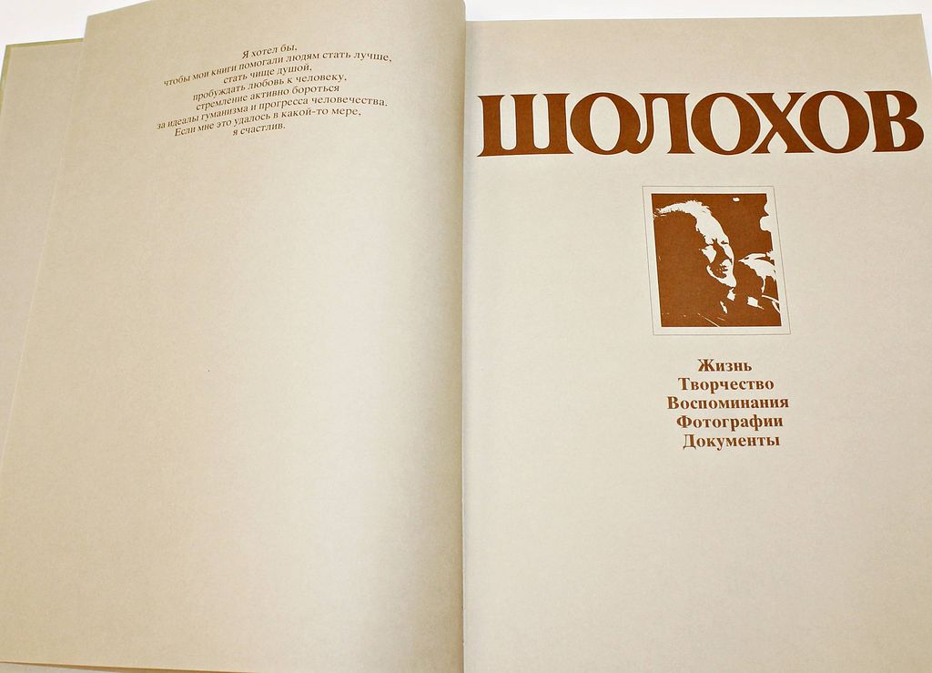 Шолохов. Жизнь. Творчество. Воспоминания. Фотографии. Документы. Фотоальбом. М.: Планета. 1985г. 280с.,ил. Замечательный фотоальбом, посвященный жизни и творчеству знаменитого советского писателя Михаила Шолохова. Он содержит воспоминания самого Шолохова, воспоминания о нем его современников, цветные и черно-белые фотографии, документы, а также отрывки из произведений Шолохова. Твердый переплет. Очень большой формат. Отличное состояние.